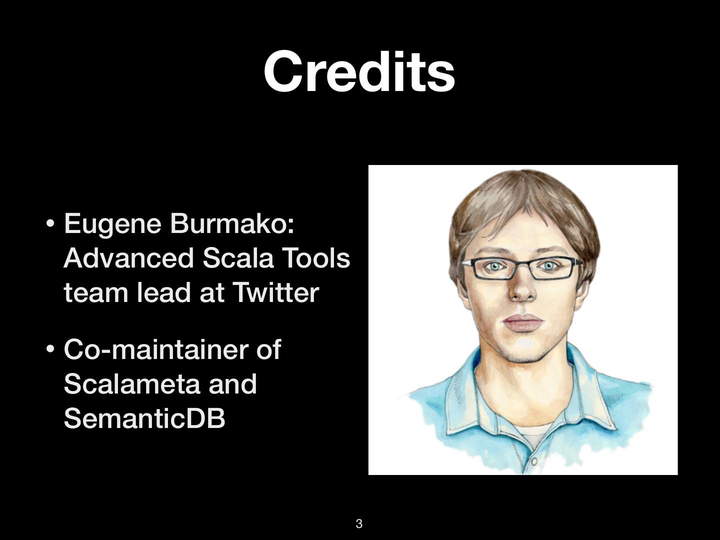 3 . Credits • Eugene Burmako: Advanced Scala Tools team lead at Twitter • Co-maintainer of Scalameta and SemanticDB 3
