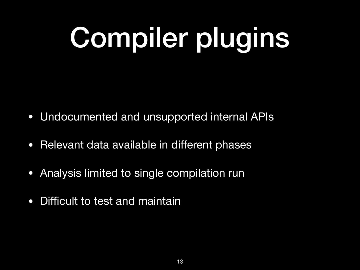 13 . Compiler plugins • Undocumented and unsupported internal APIs • Relevant data available in different phases • Analysis limited to single compilation run • Difficult to test and maintain !13