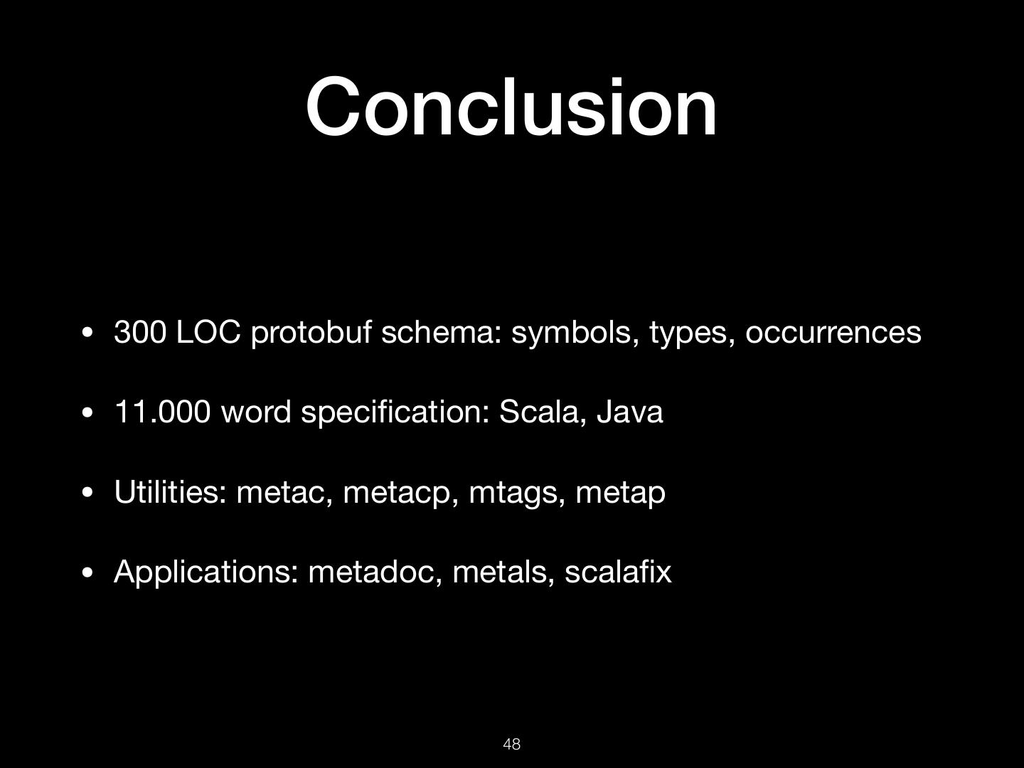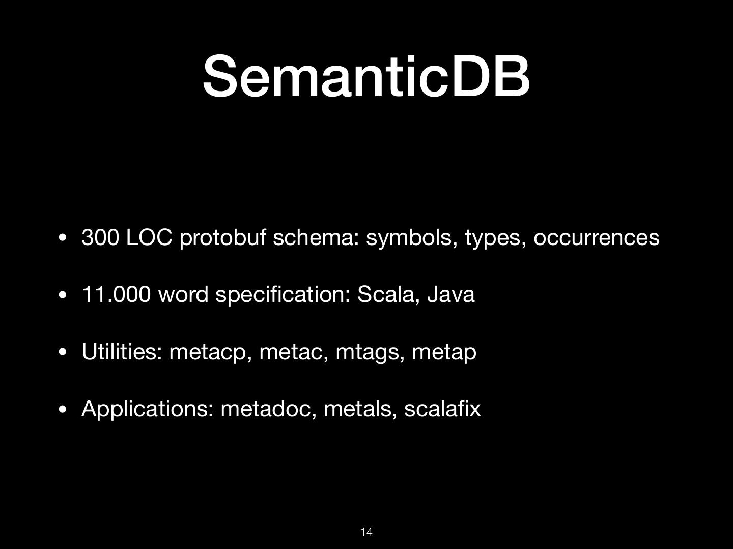 14 . SemanticDB • 300 LOC protobuf schema: symbols, types, occurrences • 11.000 word specification: Scala, Java • Utilities: metacp, metac, mtags, metap • Applications: metadoc, metals, scalafix !14