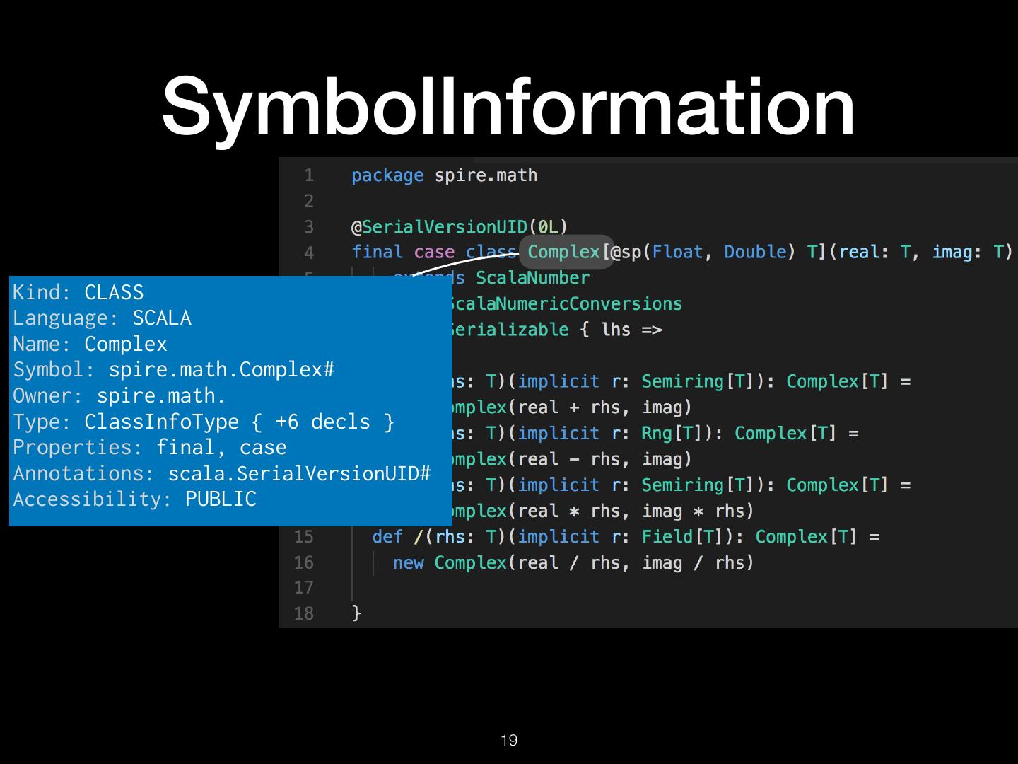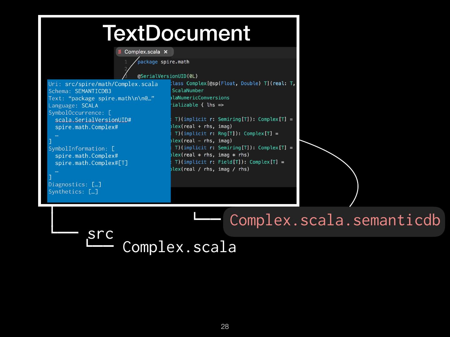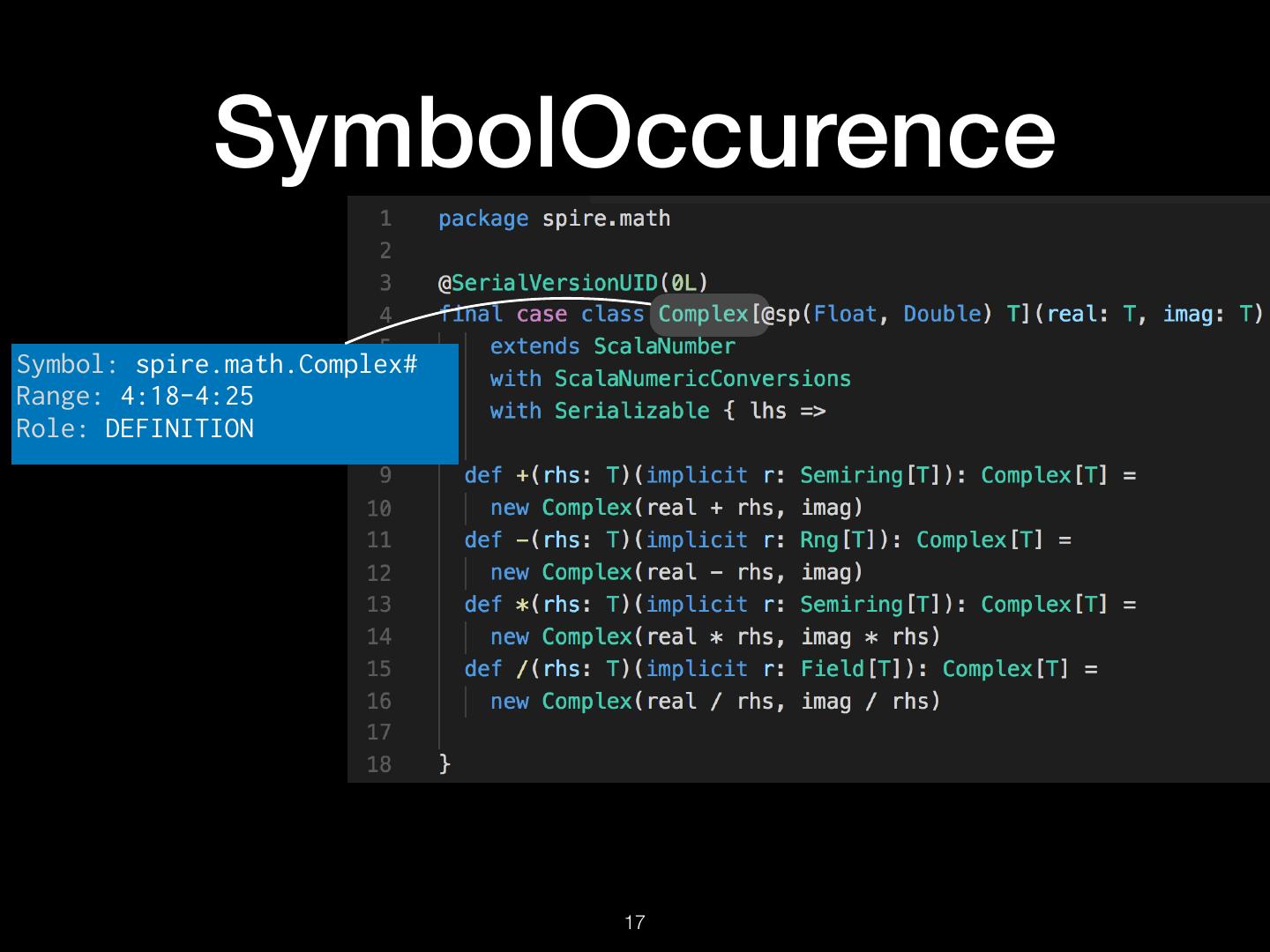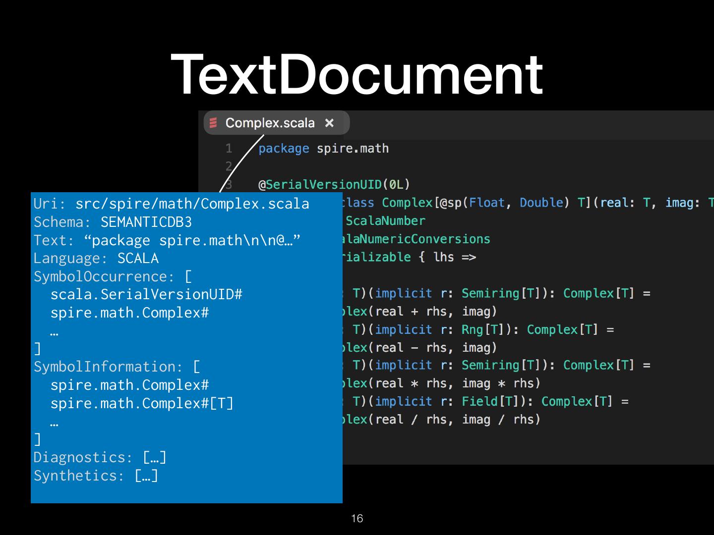 16 . TextDocument Uri: src/spire/math/Complex.scala Schema: SEMANTICDB3 Text: “package spire.math\n\n@…” Language: SCALA SymbolOccurrence: [ scala.SerialVersionUID# spire.math.Complex# … ] SymbolInformation: [ spire.math.Complex# spire.math.Complex#[T] … ] Diagnostics: […] Synthetics: […] !16
