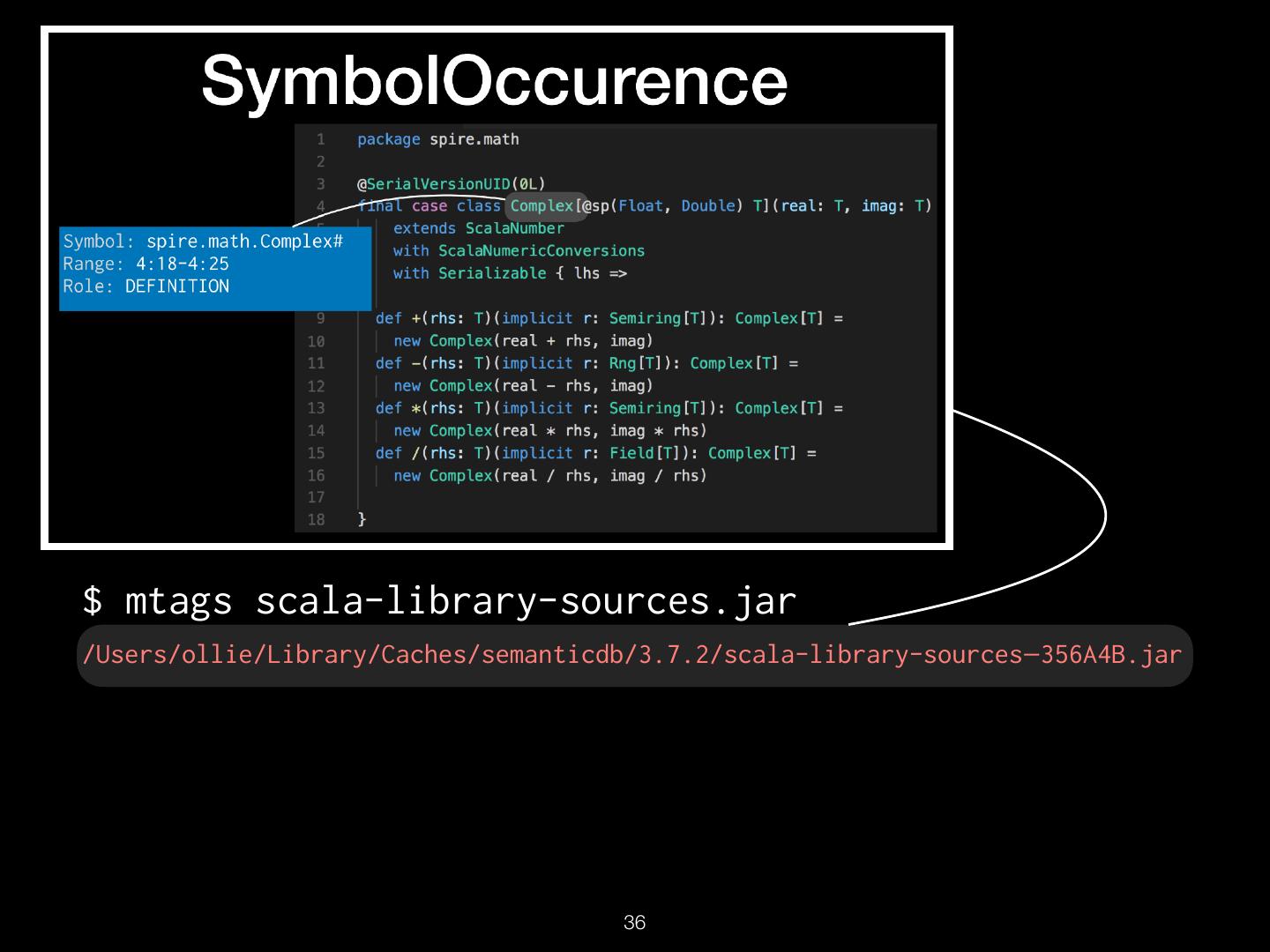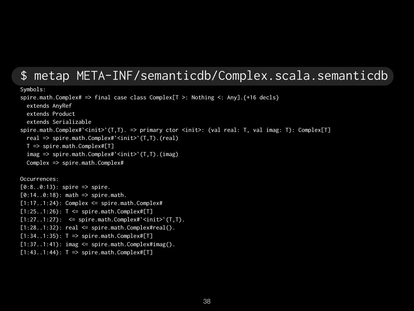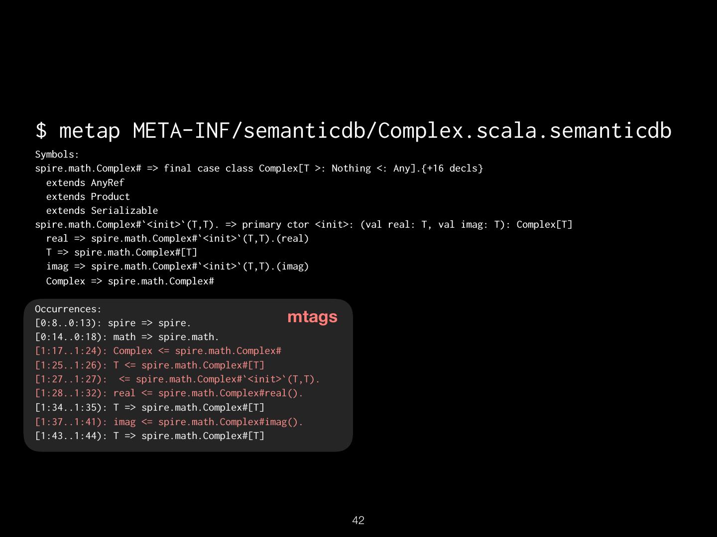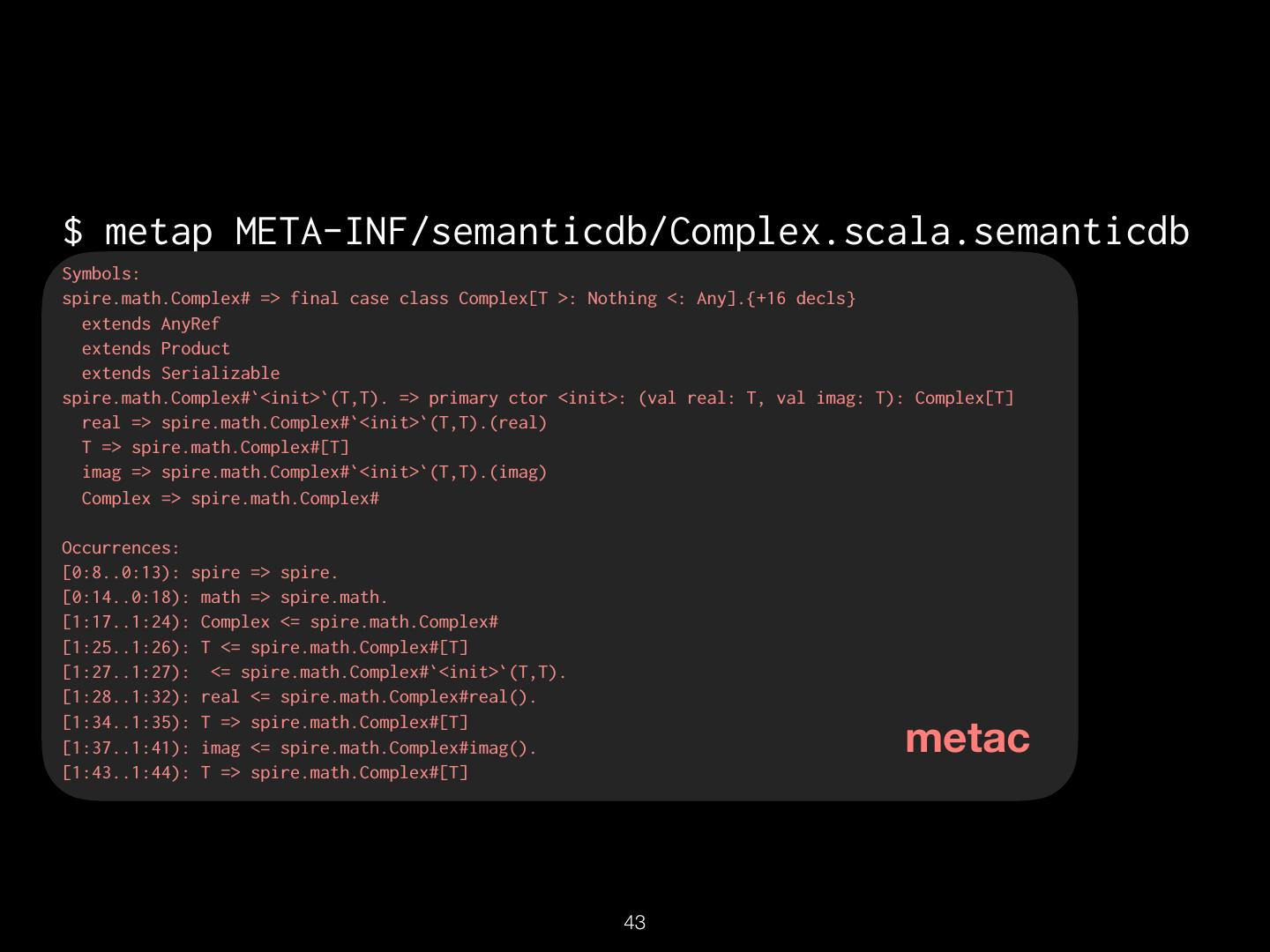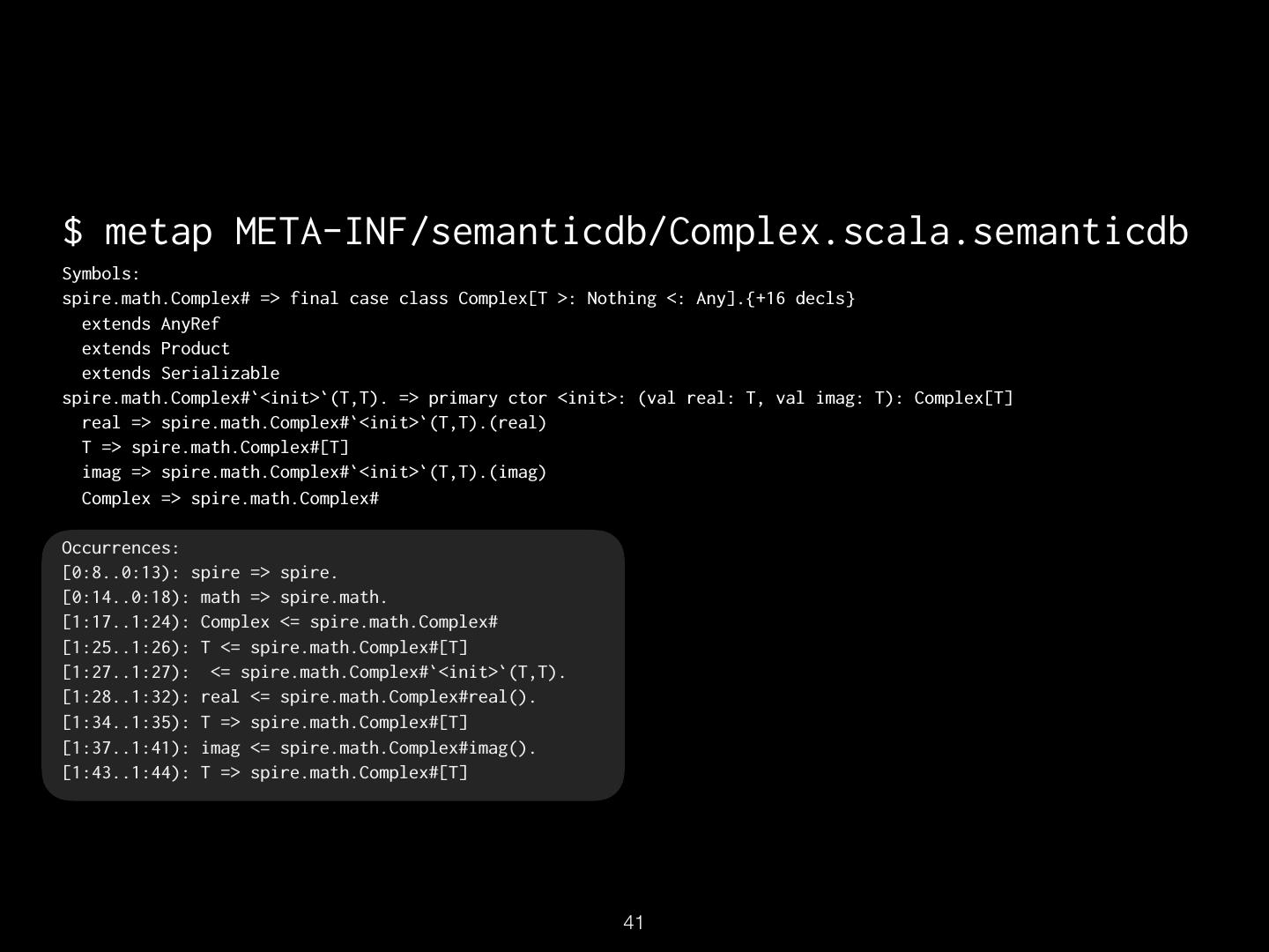 16 . TextDocument Uri: src/spire/math/Complex.scala Schema: SEMANTICDB3 Text: “package spire.math\n\n@…” Language: SCALA SymbolOccurrence: [ scala.SerialVersionUID# spire.math.Complex# … ] SymbolInformation: [ spire.math.Complex# spire.math.Complex#[T] … ] Diagnostics: […] Synthetics: […] !16