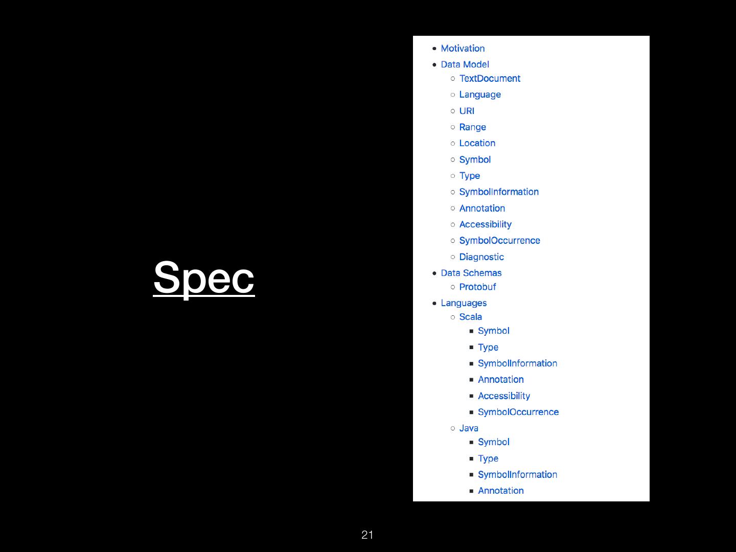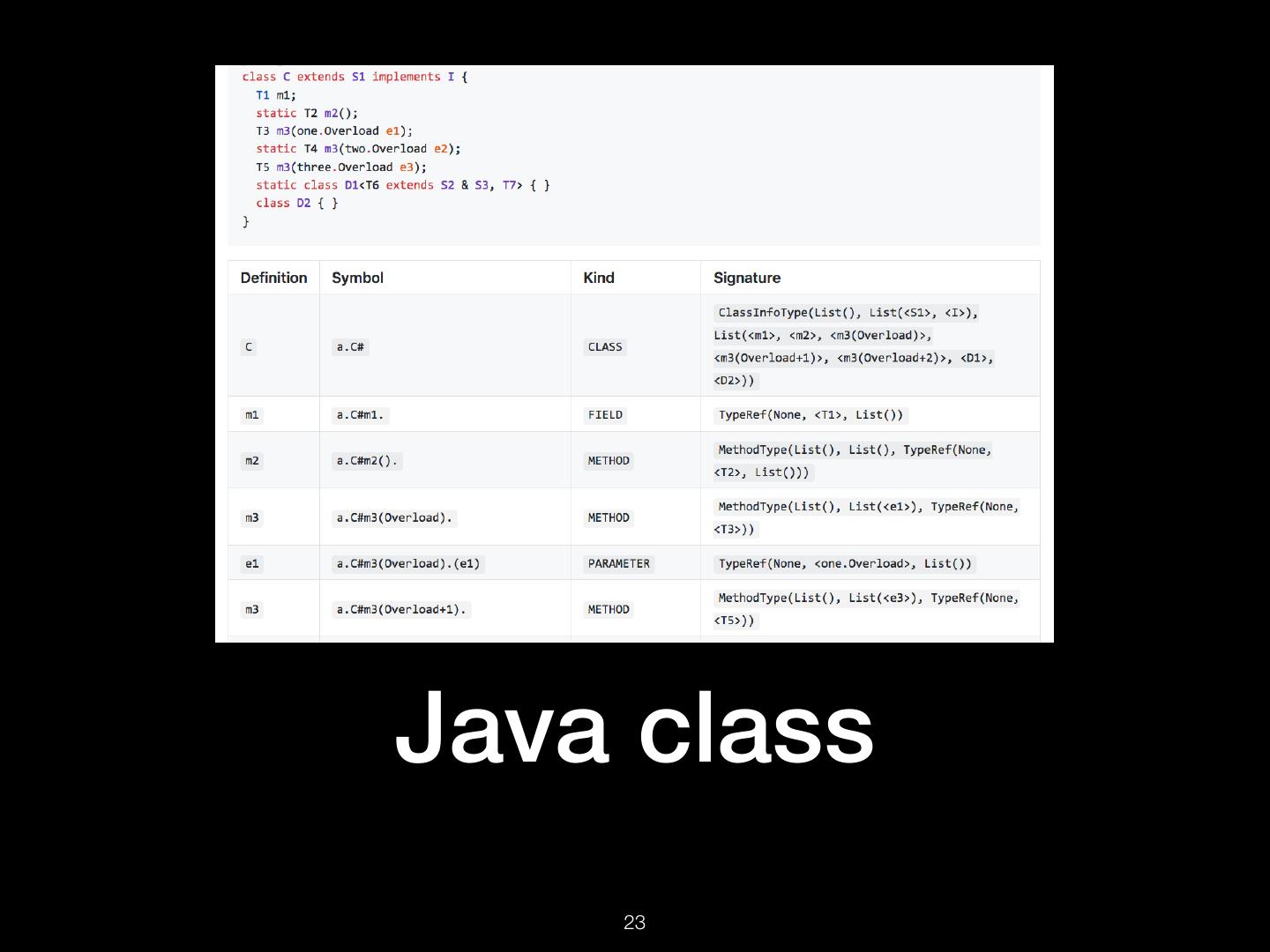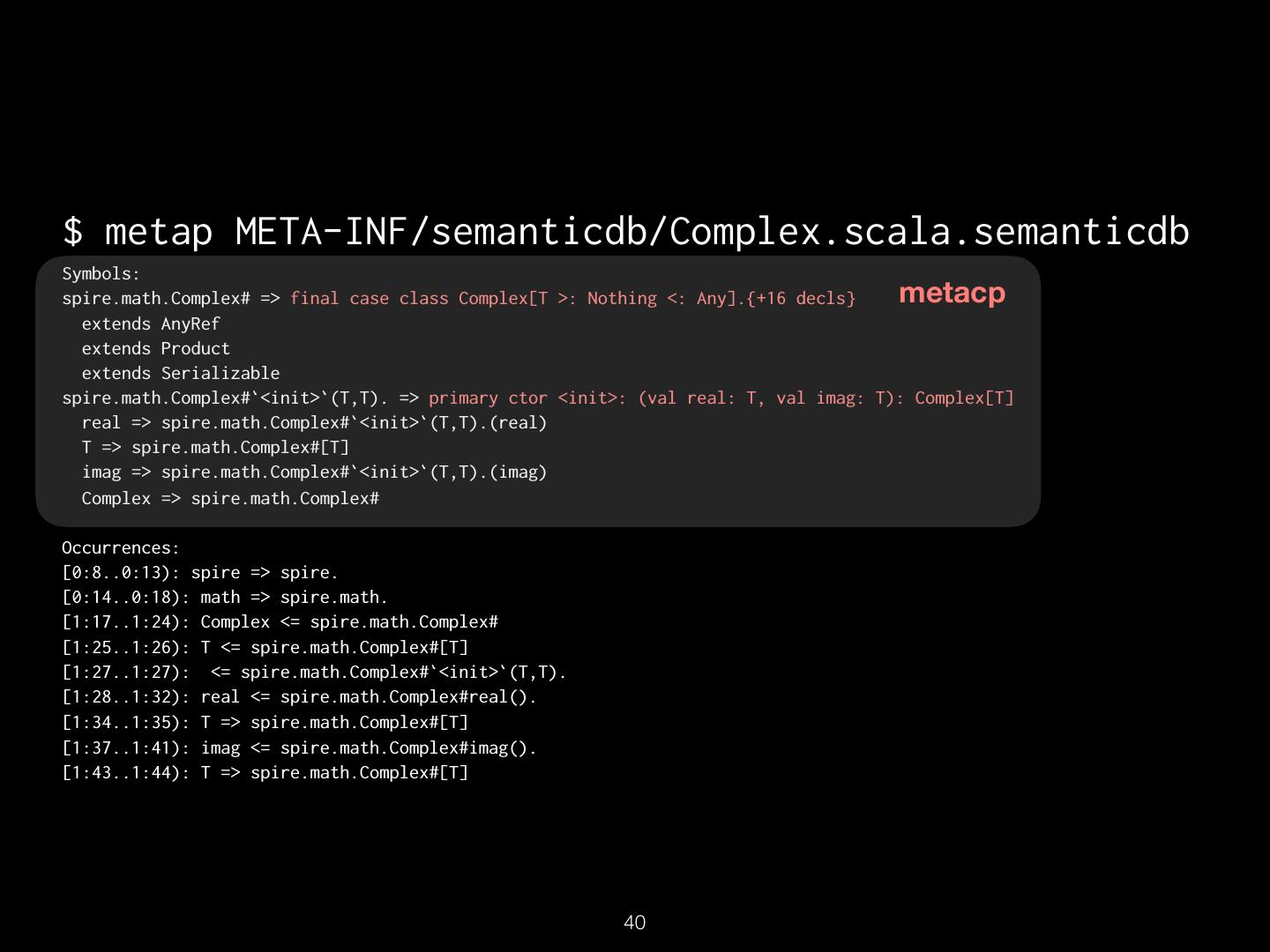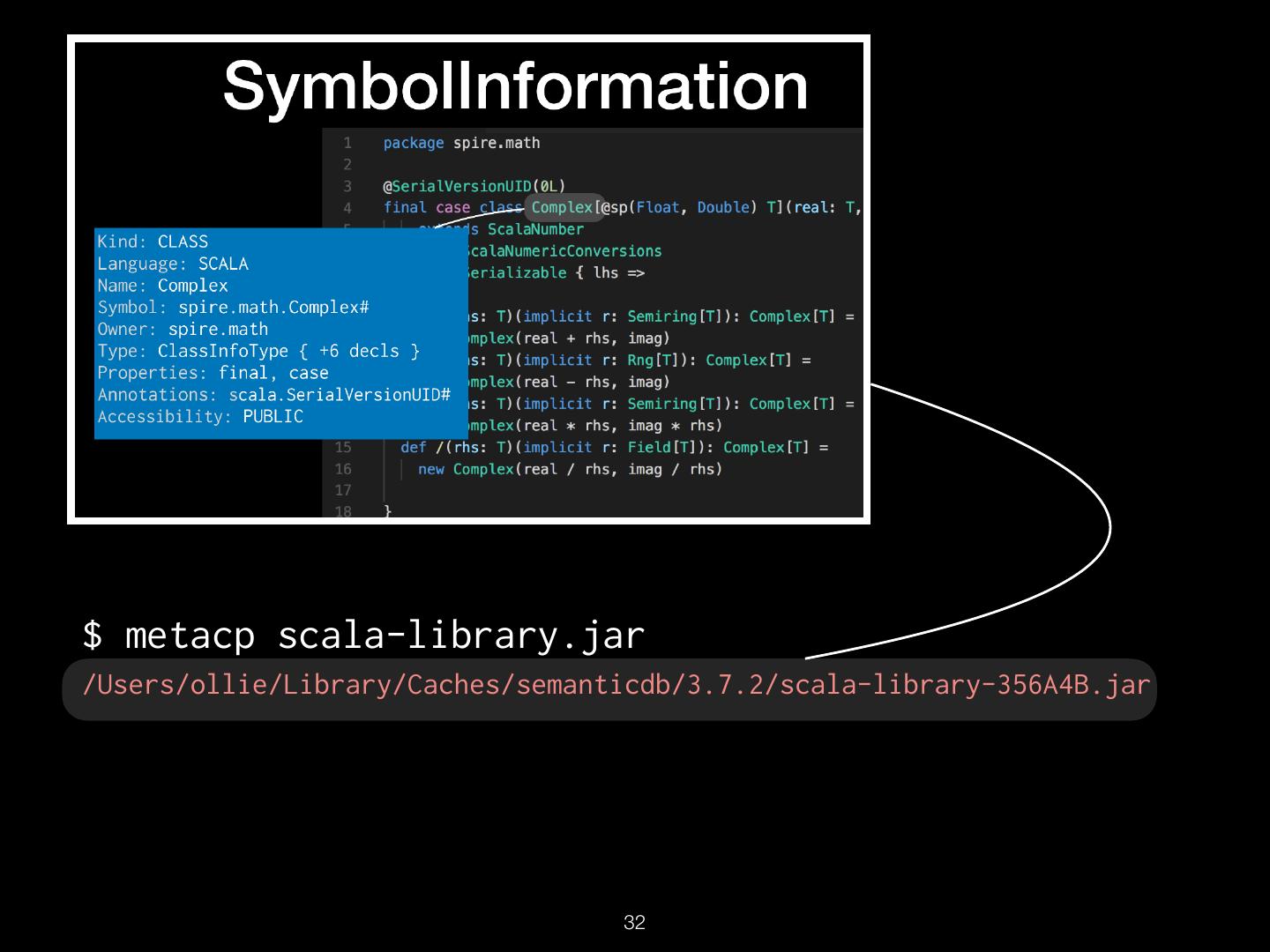 16 . TextDocument Uri: src/spire/math/Complex.scala Schema: SEMANTICDB3 Text: “package spire.math\n\n@…” Language: SCALA SymbolOccurrence: [ scala.SerialVersionUID# spire.math.Complex# … ] SymbolInformation: [ spire.math.Complex# spire.math.Complex#[T] … ] Diagnostics: […] Synthetics: […] !16
