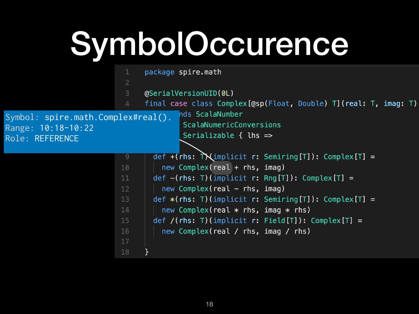 18 . SymbolOccurence Symbol: spire.math.Complex#real(). Range: 10:18-10:22 Role: REFERENCE !18