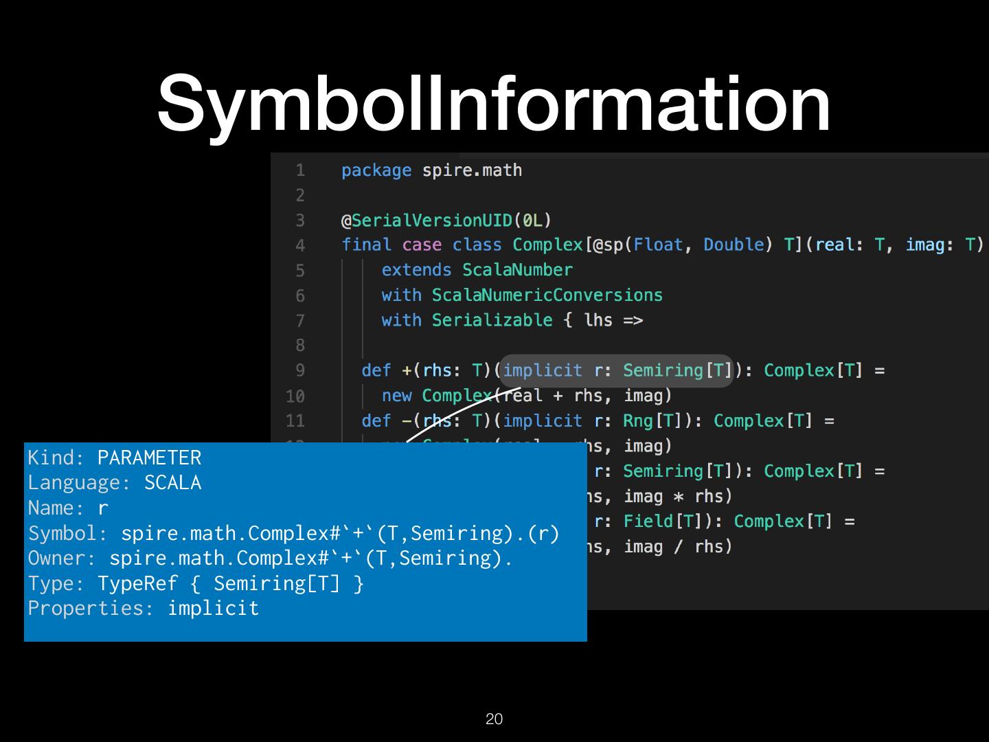 20 . SymbolInformation Kind: PARAMETER Language: SCALA Name: r Symbol: spire.math.Complex#`+`(T,Semiring).(r) Owner: spire.math.Complex#`+`(T,Semiring). Type: TypeRef { Semiring[T] } Properties: implicit !20