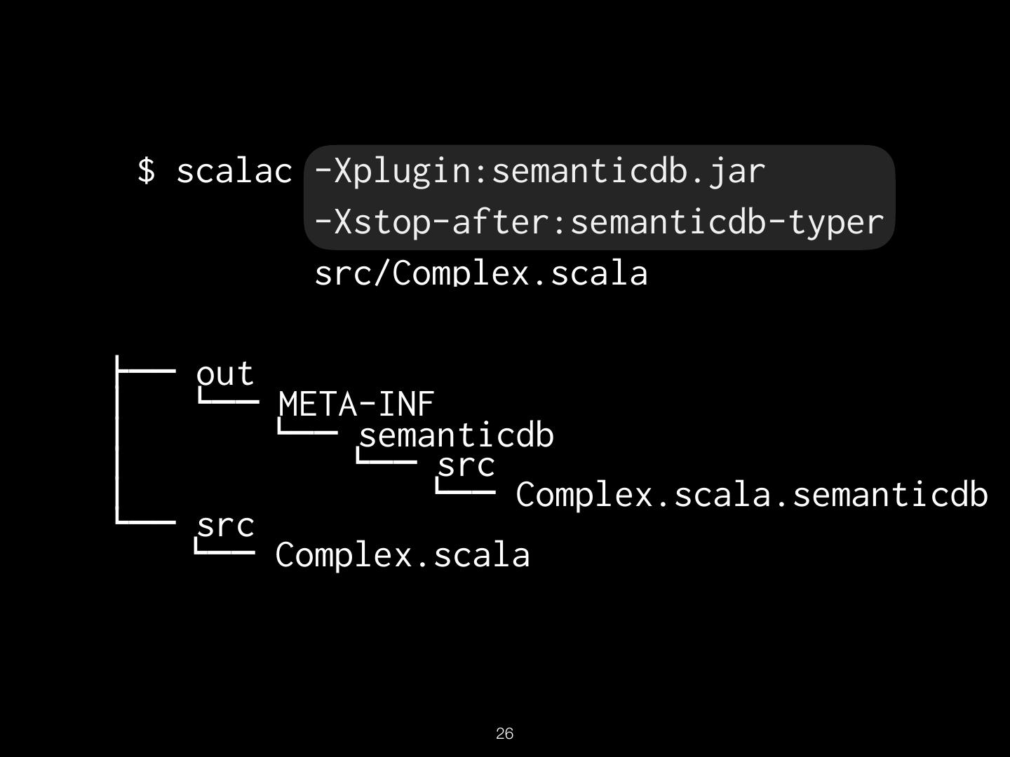 26 . $ scalac -Xplugin:semanticdb.jar -Xstop-after:semanticdb-typer src/Complex.scala "## out $ %## META-INF $ %## semanticdb $ %## src $ %## Complex.scala.semanticdb %## src %## Complex.scala !26