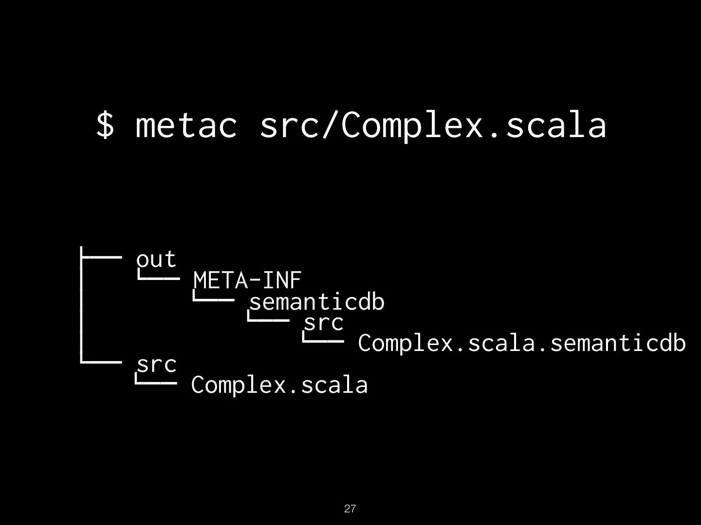 27 . $ metac src/Complex.scala "## out $ %## META-INF $ %## semanticdb $ %## src $ %## Complex.scala.semanticdb %## src %## Complex.scala !27