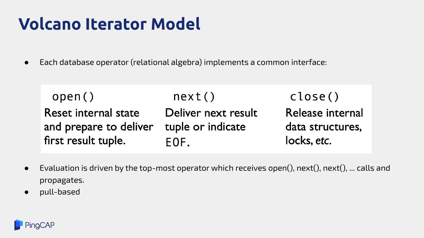 8 .Volcano Iterator Model ● Each database operator (relational algebra) implements a common interface: ● Evaluation is driven by the top-most operator which receives open(), next(), next(), ... calls and propagates. ● pull-based