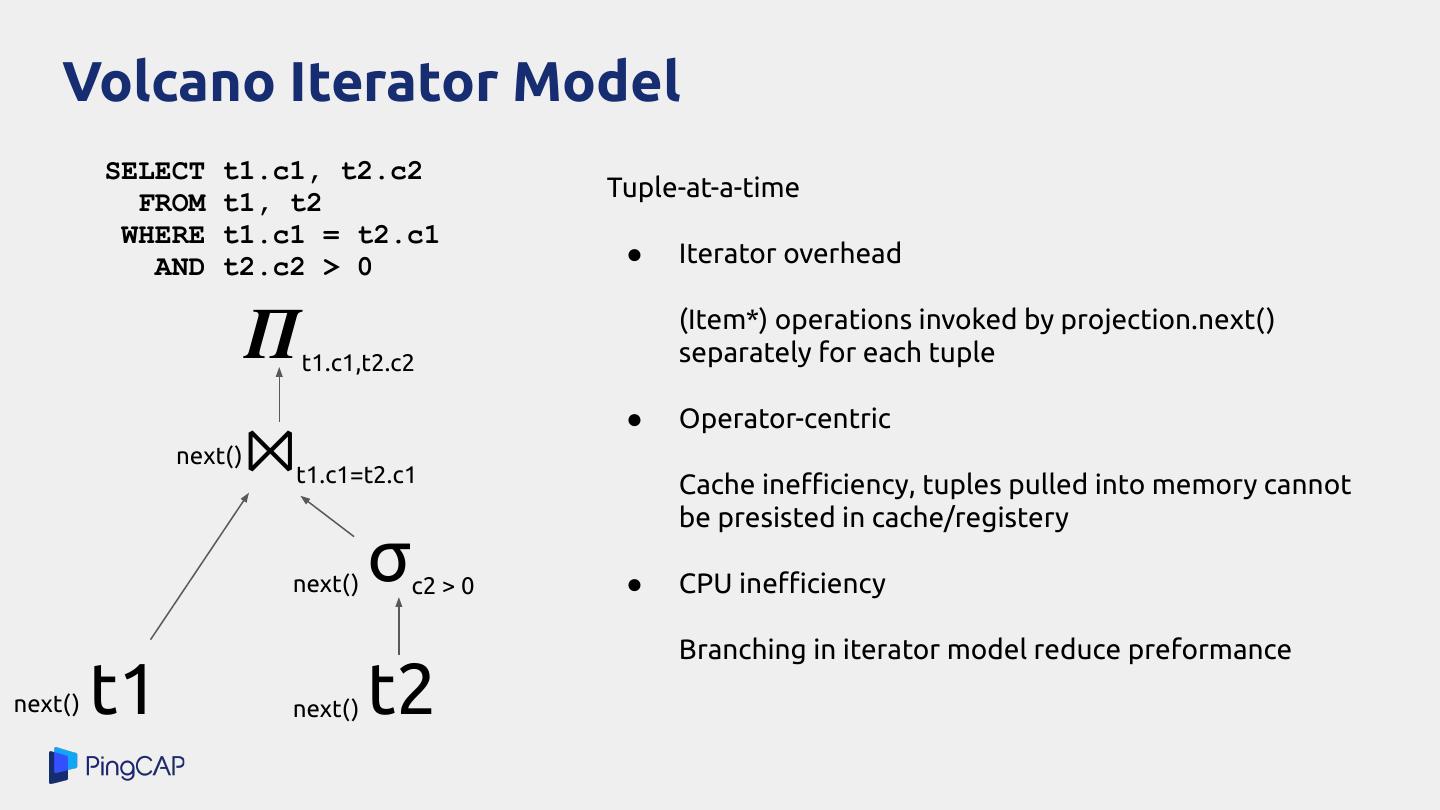 10 . Volcano Iterator Model SELECT t1.c1, t2.c2 FROM t1, t2 Tuple-at-a-time WHERE t1.c1 = t2.c1 AND t2.c2 > 0 ● Iterator overhead 𝜫 t1.c1,t2.c2 (Item*) operations invoked by projection.next() separately for each tuple ● Operator-centric next() ⨝ t1.c1=t2.c1 Cache inefficiency, tuples pulled into memory cannot be presisted in cache/registery next() σ c2 > 0 ● CPU inefficiency Branching in iterator model reduce preformance next() t1 next() t2
