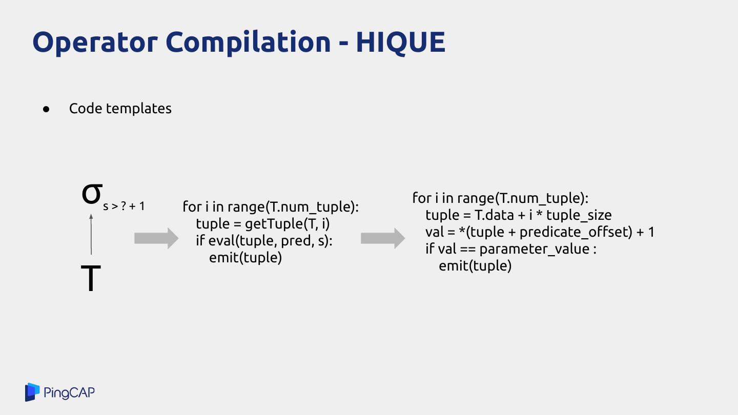 12 .Operator Compilation - HIQUE ● Code templates σ s>?+1 for i in range(T.num_tuple): for i in range(T.num_tuple): tuple = T.data + i * tuple_size tuple = getTuple(T, i) val = *(tuple + predicate_offset) + 1 if eval(tuple, pred, s): if val == parameter_value : emit(tuple) emit(tuple) T