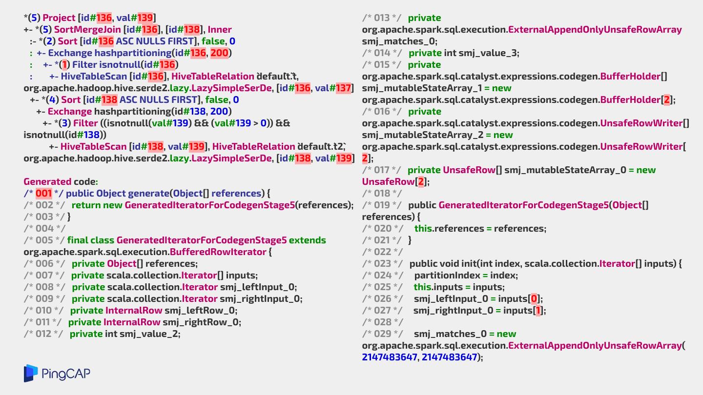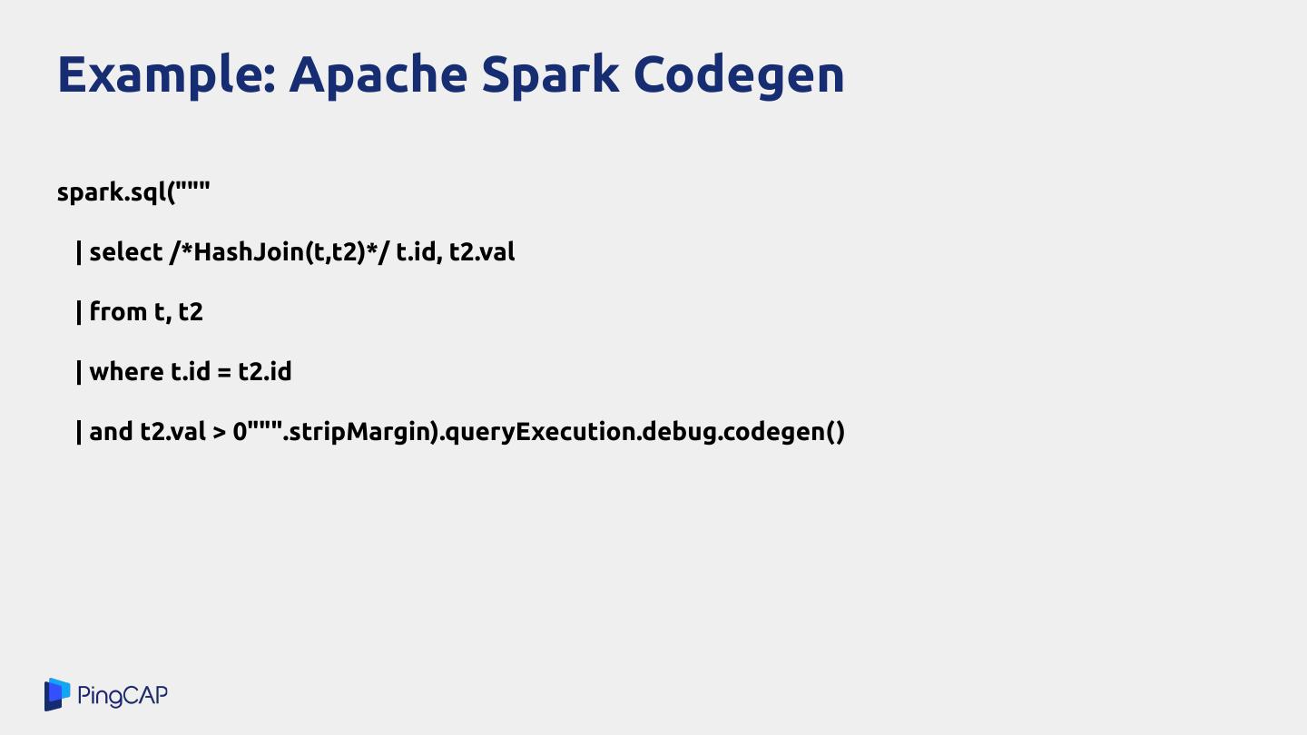 27 .High-Level Language /** * Generates code for equal expression in Java. ● Apache Spark */ def genEqual(dataType: DataType, c1: String, c2: String): String = dataType match { case BinaryType => s"java.util.Arrays.equals($c1, $c2)" Generate Java code and case FloatType => compile with Janino s"((java.lang.Float.isNaN($c1) && java.lang.Float.isNaN($c2)) || $c1 == $c2)" case DoubleType => s"((java.lang.Double.isNaN($c1) && java.lang.Double.isNaN($c2)) || $c1 == $c2)" case dt: DataType if isPrimitiveType(dt) => s"$c1 == $c2" case dt: DataType if dt.isInstanceOf[AtomicType] => s"$c1.equals($c2)" case array: ArrayType => genComp(array, c1, c2) + " == 0" case struct: StructType => genComp(struct, c1, c2) + " == 0" case udt: UserDefinedType[_] => genEqual(udt.sqlType, c1, c2) case NullType => "false" case _ => throw new IllegalArgumentException( "cannot generate equality code for un-comparable type: " + dataType.catalogString) }