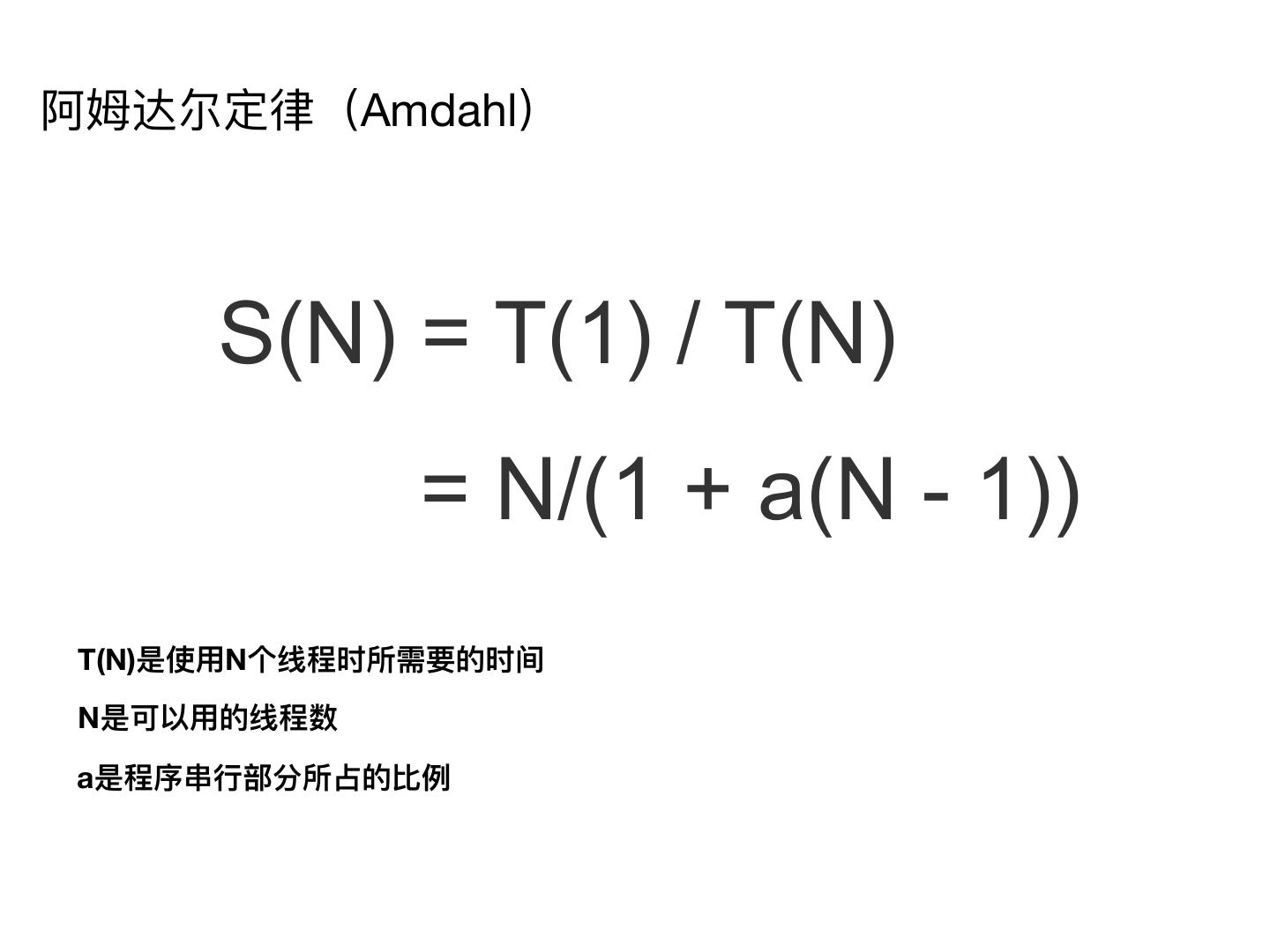 7 .阿姆达尔定律律(Amdahl) S(N) = T(1) / T(N) = N/(1 + a(N - 1)) T(N)是使⽤用N个线程时所需要的时间 N是可以⽤用的线程数 a是程序串串⾏行行部分所占的⽐比例例