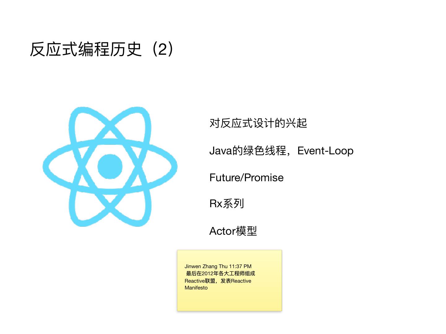 13 .反应式编程历史(2) 对反应式设计的兴起 Java的绿⾊色线程,Event-Loop Future/Promise Rx系列列 Actor模型 Jinwen Zhang Thu 11:37 PM 最后在2012年年各⼤大⼯工程师组成 Reactive联盟,发表Reactive Manifesto