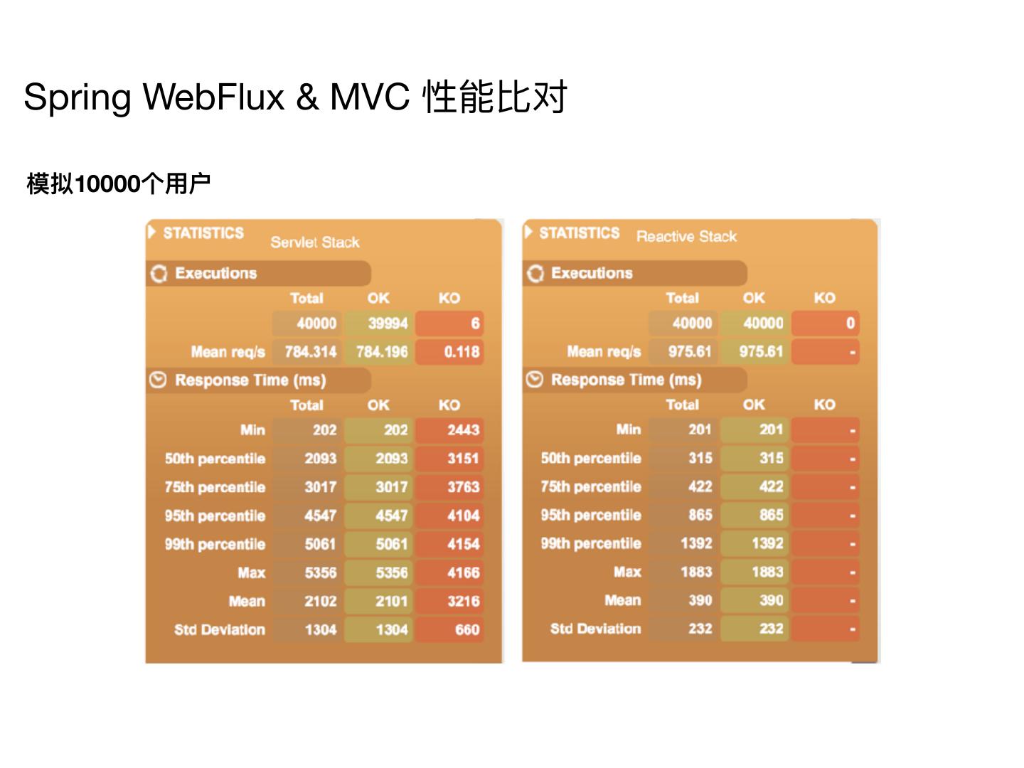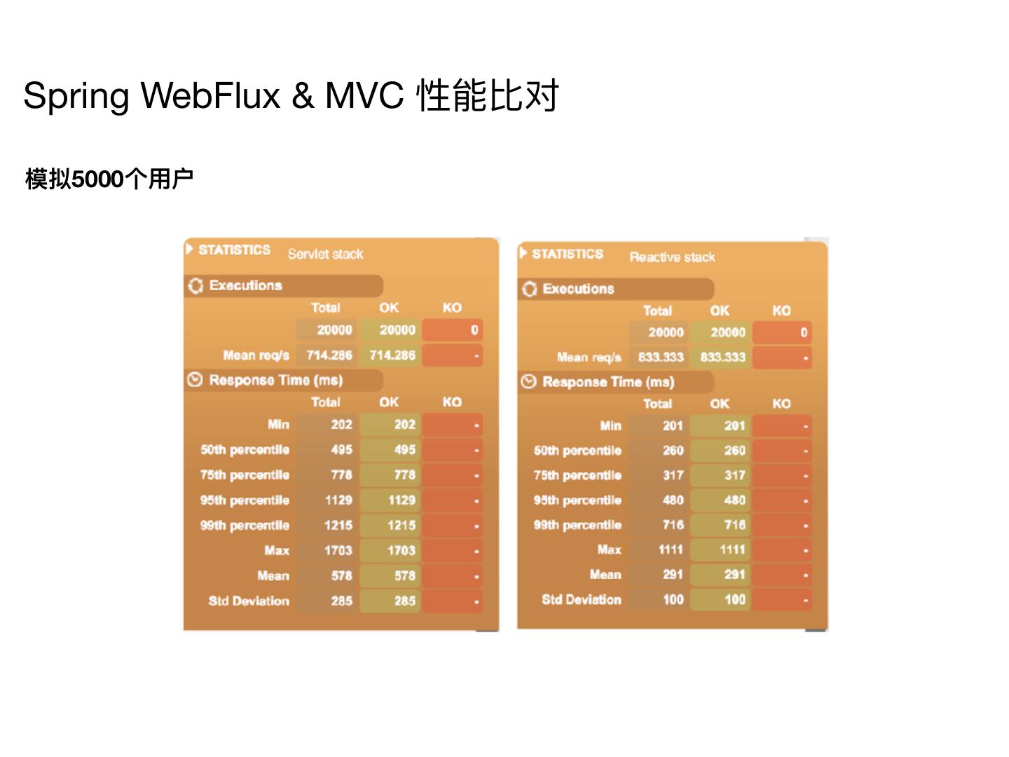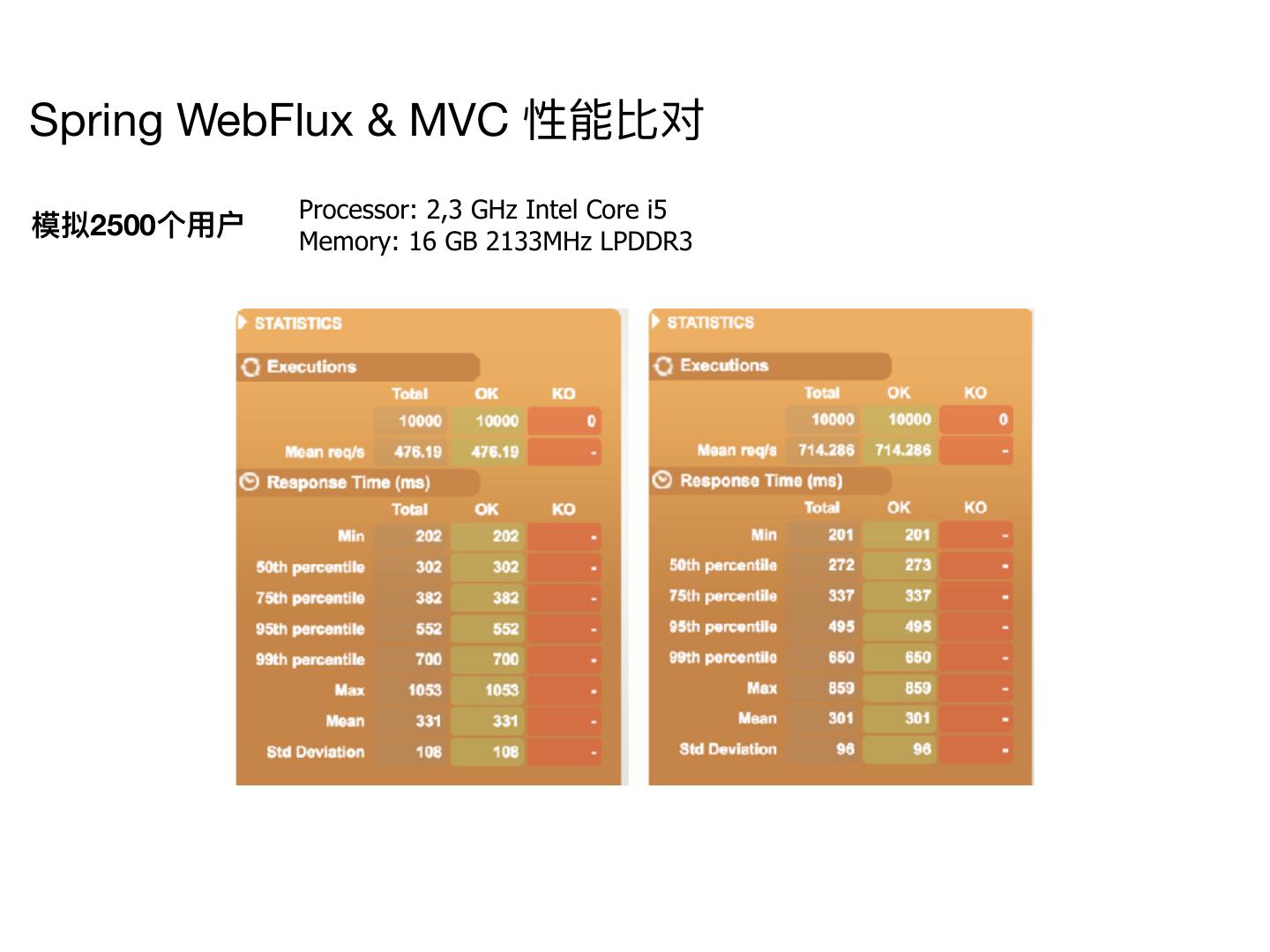 29 .Spring WebFlux & MVC 性能⽐比对 Processor: 2,3 GHz Intel Core i5 模拟2500个⽤用户 Memory: 16 GB 2133MHz LPDDR3