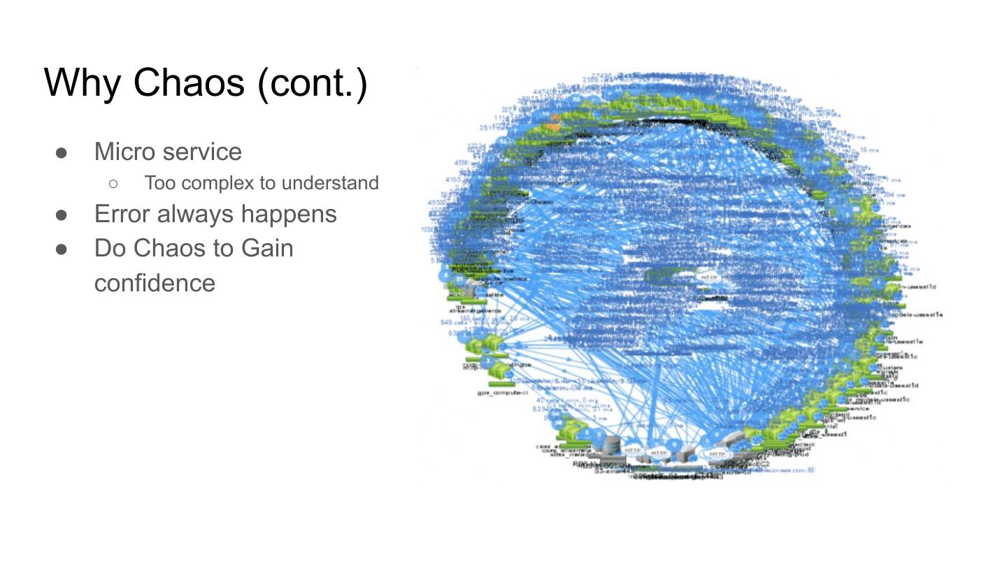7 .Why Chaos (cont.) ● Micro service ○ Too complex to understand ● Error always happens ● Do Chaos to Gain confidence