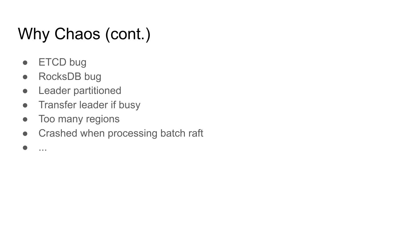 9 .Why Chaos (cont.) ● ETCD bug ● RocksDB bug ● Leader partitioned ● Transfer leader if busy ● Too many regions ● Crashed when processing batch raft ● ...