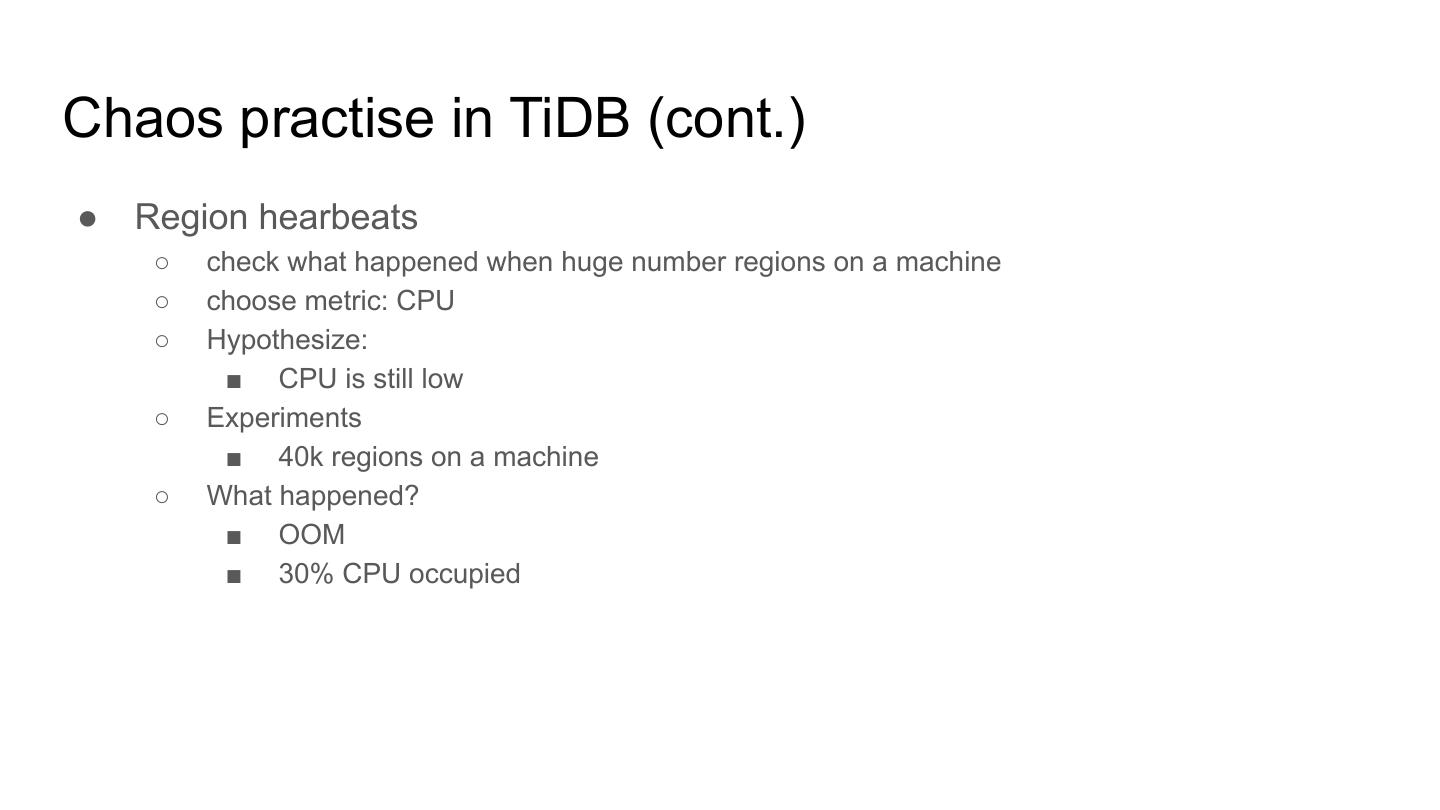 12 .Chaos practise in TiDB (cont.) ● Region hearbeats ○ check what happened when huge number regions on a machine ○ choose metric: CPU ○ Hypothesize: ■ CPU is still low ○ Experiments ■ 40k regions on a machine ○ What happened? ■ OOM ■ 30% CPU occupied