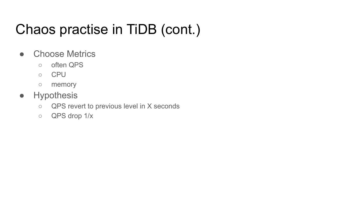 13 .Chaos practise in TiDB (cont.) ● Choose Metrics ○ often QPS ○ CPU ○ memory ● Hypothesis ○ QPS revert to previous level in X seconds ○ QPS drop 1/x