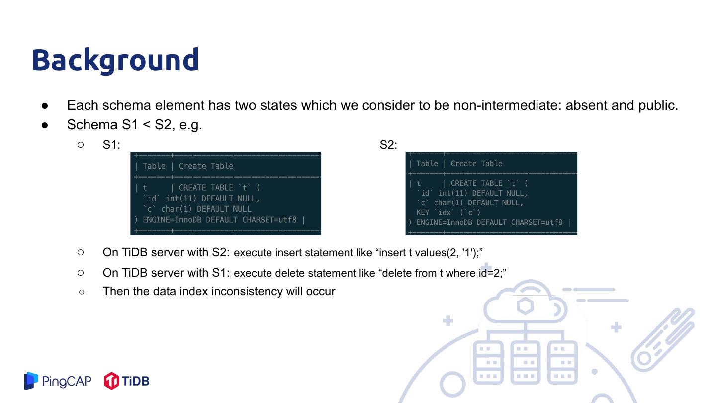 4 .Background ● Each schema element has two states which we consider to be non-intermediate: absent and public. ● Schema S1 < S2, e.g. ○ S1: S2: ○ On TiDB server with S2: execute insert statement like “insert t values(2, '1');” ○ On TiDB server with S1: execute delete statement like “delete from t where id=2;” ○ Then the data index inconsistency will occur