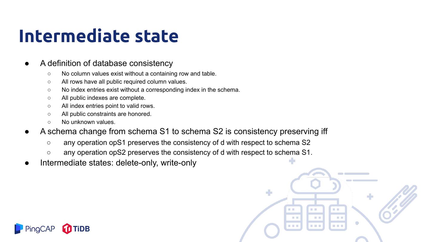 5 .Intermediate state ● A definition of database consistency ○ No column values exist without a containing row and table. ○ All rows have all public required column values. ○ No index entries exist without a corresponding index in the schema. ○ All public indexes are complete. ○ All index entries point to valid rows. ○ All public constraints are honored. ○ No unknown values. ● A schema change from schema S1 to schema S2 is consistency preserving iff ○ any operation opS1 preserves the consistency of d with respect to schema S2 ○ any operation opS2 preserves the consistency of d with respect to schema S1. ● Intermediate states: delete-only, write-only
