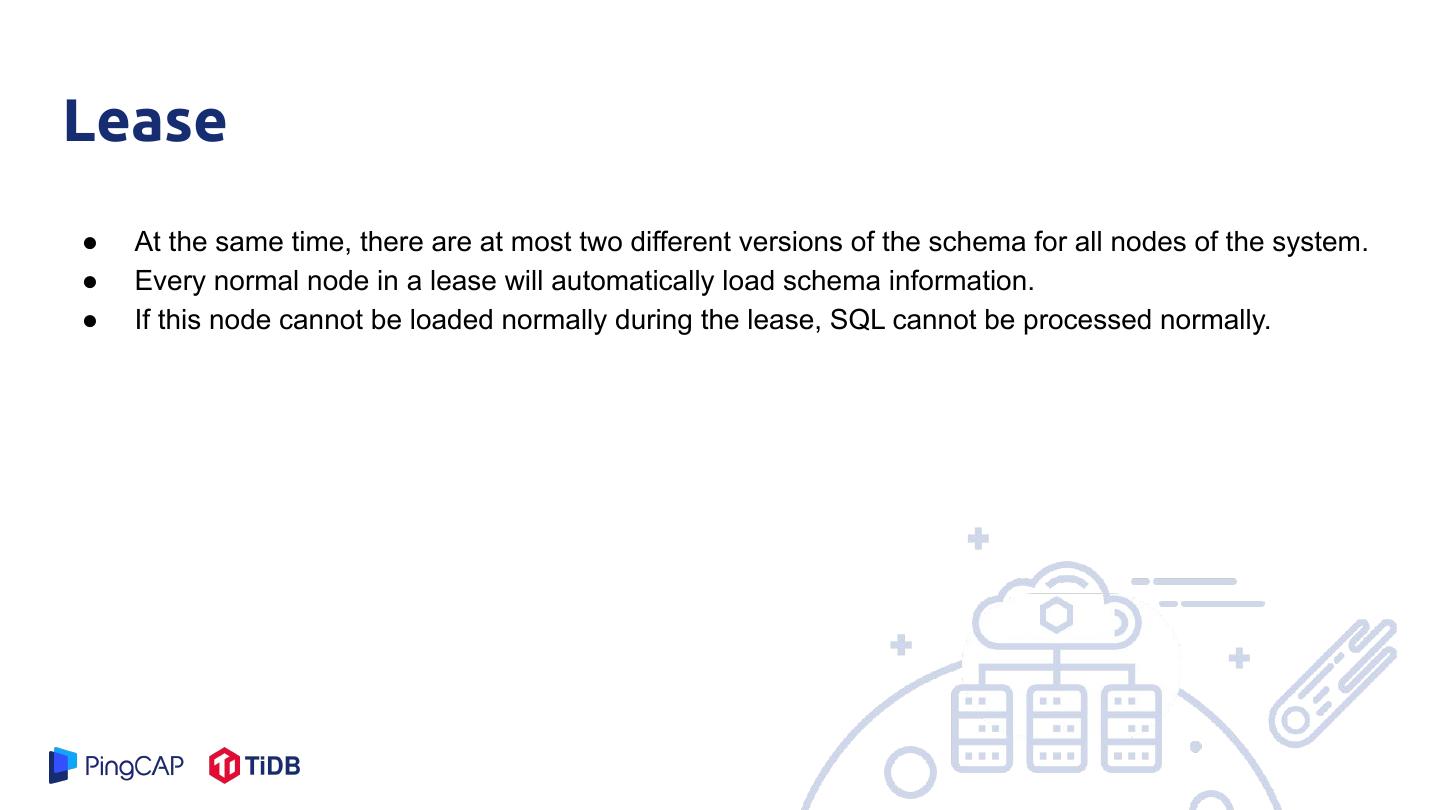6 .Lease ● At the same time, there are at most two different versions of the schema for all nodes of the system. ● Every normal node in a lease will automatically load schema information. ● If this node cannot be loaded normally during the lease, SQL cannot be processed normally.