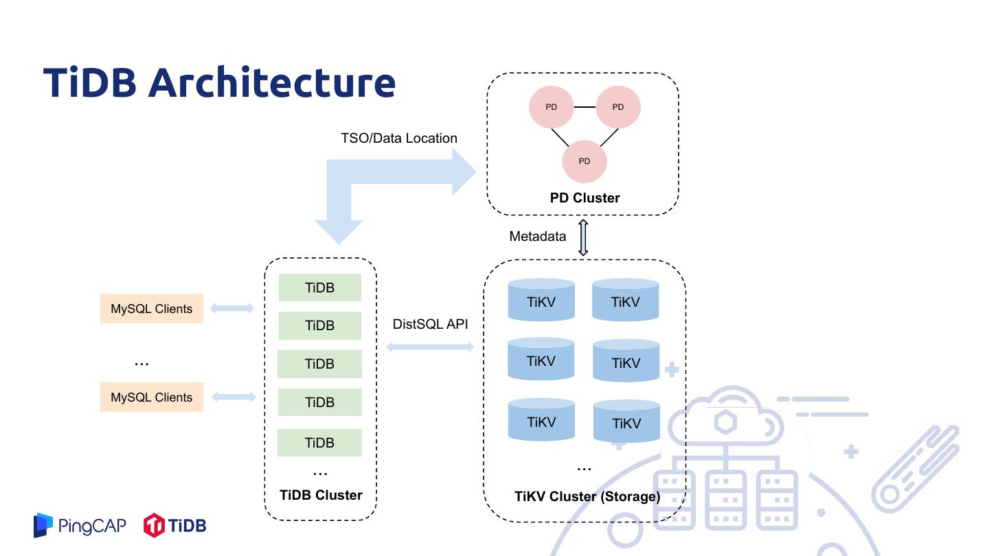 8 .TiDB Architecture PD PD TSO/Data Location PD PD Cluster Metadata TiDB MySQL Clients TiKV TiKV TiDB DistSQL API ... TiDB TiKV TiKV MySQL Clients TiDB TiKV TiKV TiDB ... ... TiDB Cluster TiKV Cluster (Storage)