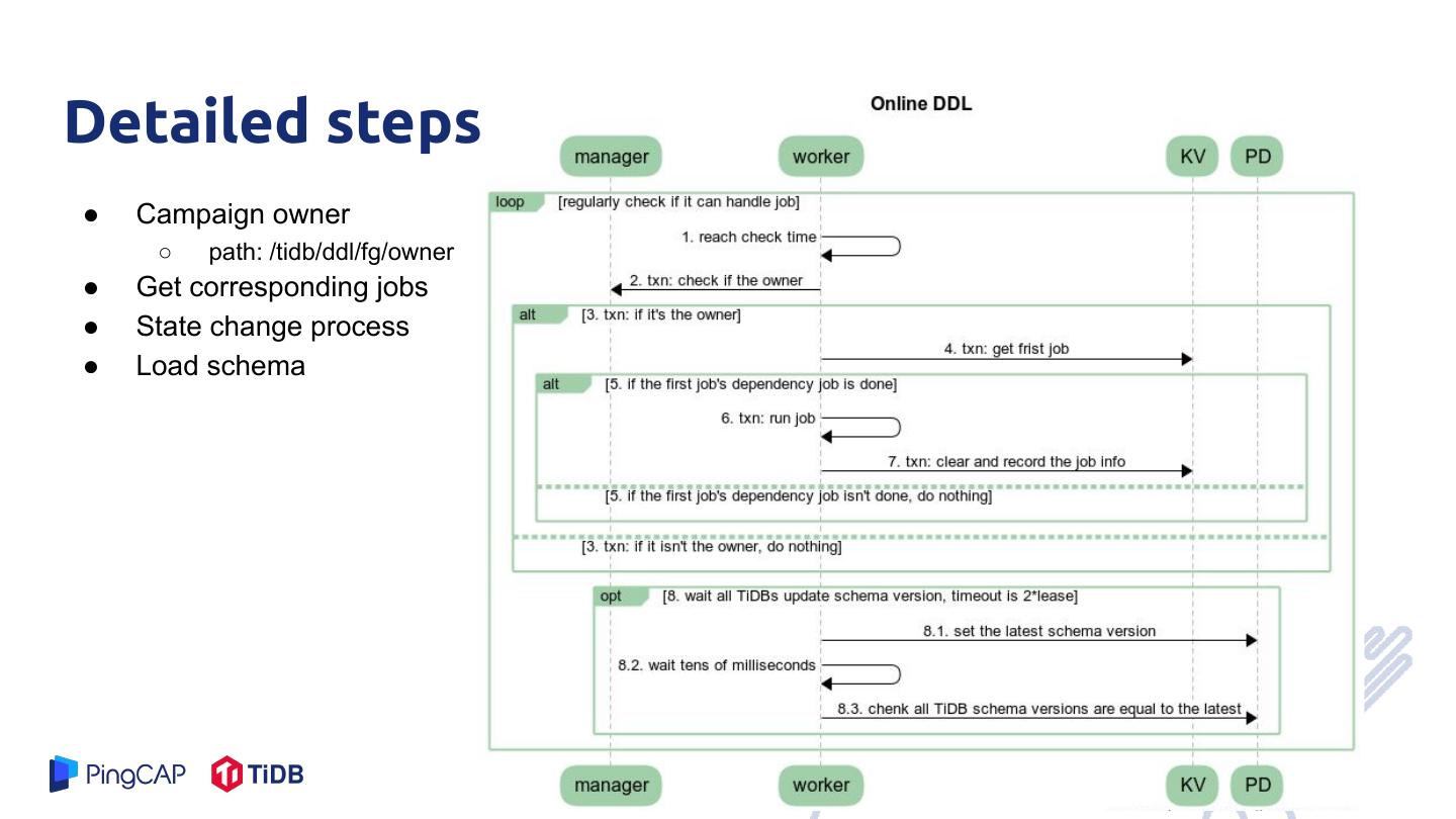 12 .Detailed steps ● State change process ○ Each DDL job requires multiple state changes. e.g. ■ create table: none -> public ■ add index: none -> delete only -> write only -> write reorg -> public ○ Update schema: ■ Update schema and a state ■ Update the latest schema version to PD ■ Wait for all TiDB servers to update to the latest schema information. ○ Loading schema: ■ Load the latest schema regularly ■ Load the latest schema when a TiDB receives a notification of the latest schema version update