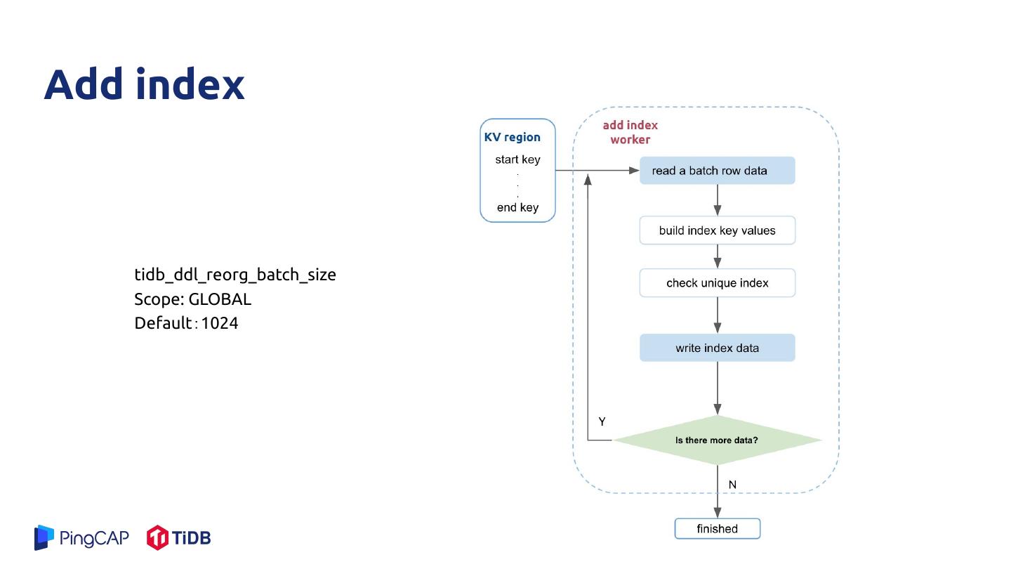 17 .Add index ● Backfill the data into the index tidb_ddl_reorg_worker_cnt Scope: GLOBAL Default:16