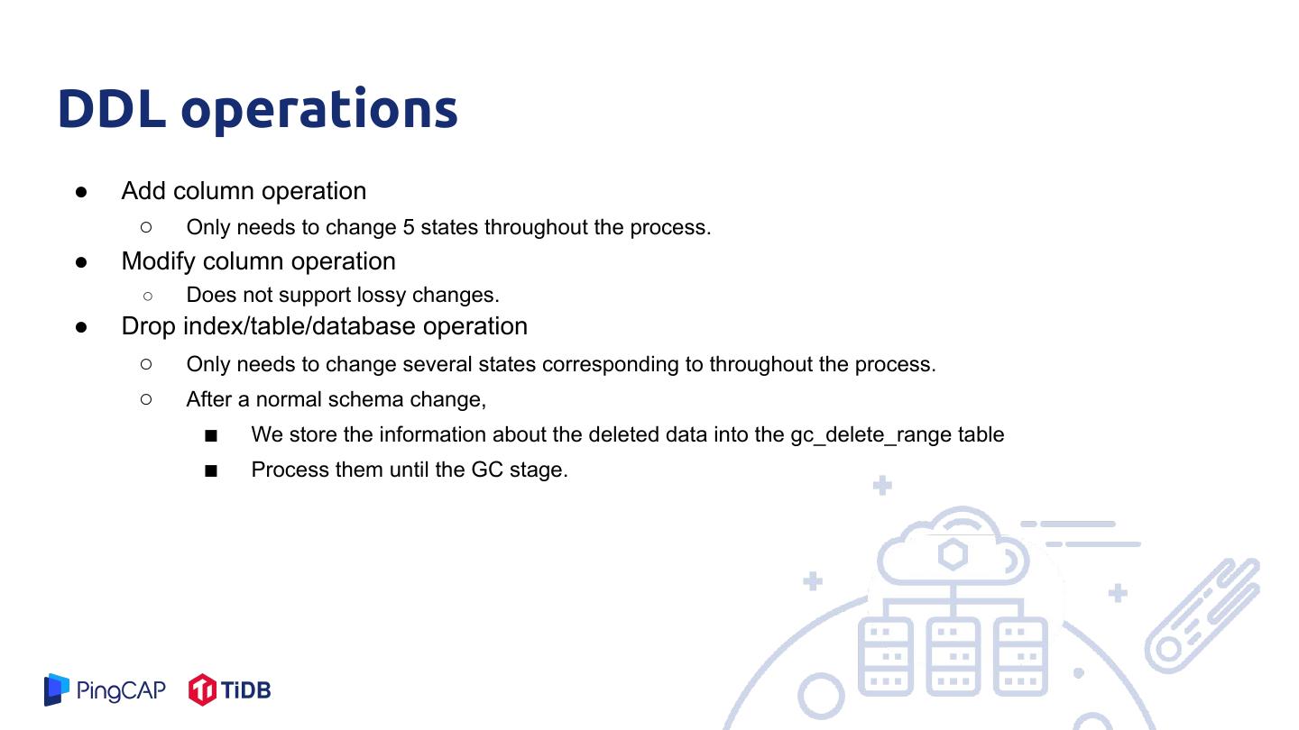 21 .DDL operations ● Add column operation ○ Only needs to change 5 states throughout the process. ● Modify column operation ○ Does not support lossy changes. ● Drop index/table/database operation ○ Only needs to change several states corresponding to throughout the process. ○ After a normal schema change, ■ We store the information about the deleted data into the gc_delete_range table ■ Process them until the GC stage.