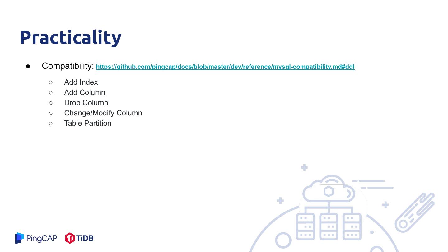 23 .Practicality ● Compatibility: https://github.com/pingcap/docs/blob/master/dev/reference/mysql-compatibility.md#ddl ○ Add Index ○ Add Column ○ Drop Column ○ Change/Modify Column ○ Table Partition