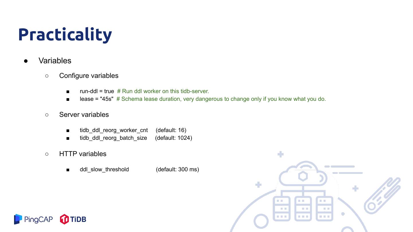 24 .Practicality ● Variables ○ Configure variables ■ run-ddl = true # Run ddl worker on this tidb-server. ■ lease = "45s" # Schema lease duration, very dangerous to change only if you know what you do. ○ Server variables ■ tidb_ddl_reorg_worker_cnt (default: 16) ■ tidb_ddl_reorg_batch_size (default: 1024) ○ HTTP variables ■ ddl_slow_threshold (default: 300 ms)