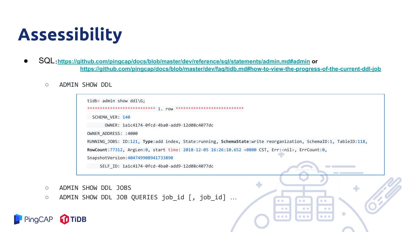 25 .Assessibility ● SQL:https://github.com/pingcap/docs/blob/master/dev/reference/sql/statements/admin.md#admin or https://github.com/pingcap/docs/blob/master/dev/faq/tidb.md#how-to-view-the-progress-of-the-current-ddl-job ○ ADMIN SHOW DDL tidb> admin show ddl\G; *************************** 1. row *************************** SCHEMA_VER: 140 OWNER: 1a1c4174-0fcd-4ba0-add9-12d08c4077dc OWNER_ADDRESS: :4000 RUNNING_JOBS: ID:121, Type:add index, State:running, SchemaState:write reorganization, SchemaID:1, TableID:118, RowCount:77312, ArgLen:0, start time: 2018-12-05 16:26:10.652 +0800 CST, Err:<nil>, ErrCount:0, SnapshotVersion:404749908941733890 SELF_ID: 1a1c4174-0fcd-4ba0-add9-12d08c4077dc ○ ADMIN SHOW DDL JOBS ○ ADMIN SHOW DDL JOB QUERIES job_id [, job_id] …