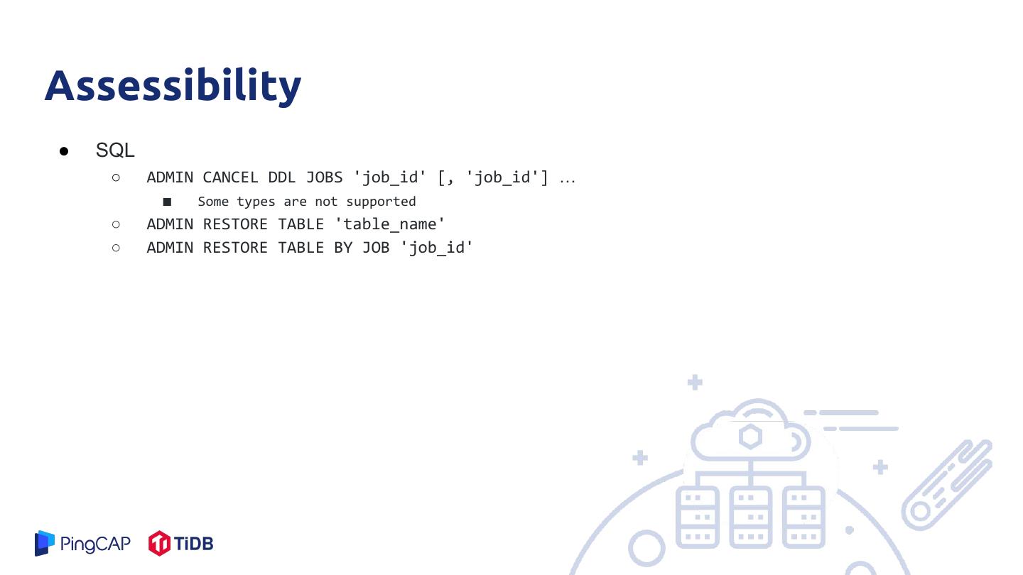26 .Assessibility ● SQL ○ ADMIN CANCEL DDL JOBS 'job_id' [, 'job_id'] … ■ Some types are not supported ○ ADMIN RESTORE TABLE 'table_name' ○ ADMIN RESTORE TABLE BY JOB 'job_id'