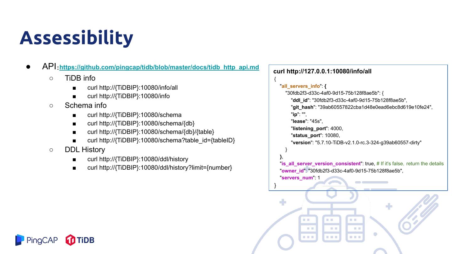 27 .Assessibility ● API:https://github.com/pingcap/tidb/blob/master/docs/tidb_http_api.md curl http://127.0.0.1:10080/info/all ○ TiDB info { ■ curl http://{TiDBIP}:10080/info/all "all_servers_info": { "30fdb2f3-d33c-4af0-9d15-75b128f8ae5b": { ■ curl http://{TiDBIP}:10080/info "ddl_id": "30fdb2f3-d33c-4af0-9d15-75b128f8ae5b", ○ Schema info "git_hash": "39ab60557822cba1d48e0ead6ebc8d619e10fe24", ■ curl http://{TiDBIP}:10080/schema "ip": "", ■ curl http://{TiDBIP}:10080/schema/{db} "lease": "45s", "listening_port": 4000, ■ curl http://{TiDBIP}:10080/schema/{db}/{table} "status_port": 10080, ■ curl http://{TiDBIP}:10080/schema?table_id={tableID} "version": "5.7.10-TiDB-v2.1.0-rc.3-324-g39ab60557-dirty" ○ DDL History } }, ■ curl http://{TiDBIP}:10080/ddl/history "is_all_server_version_consistent": true, # If it's false,return the details ■ curl http://{TiDBIP}:10080/ddl/history?limit={number} "owner_id": "30fdb2f3-d33c-4af0-9d15-75b128f8ae5b", "servers_num": 1 }