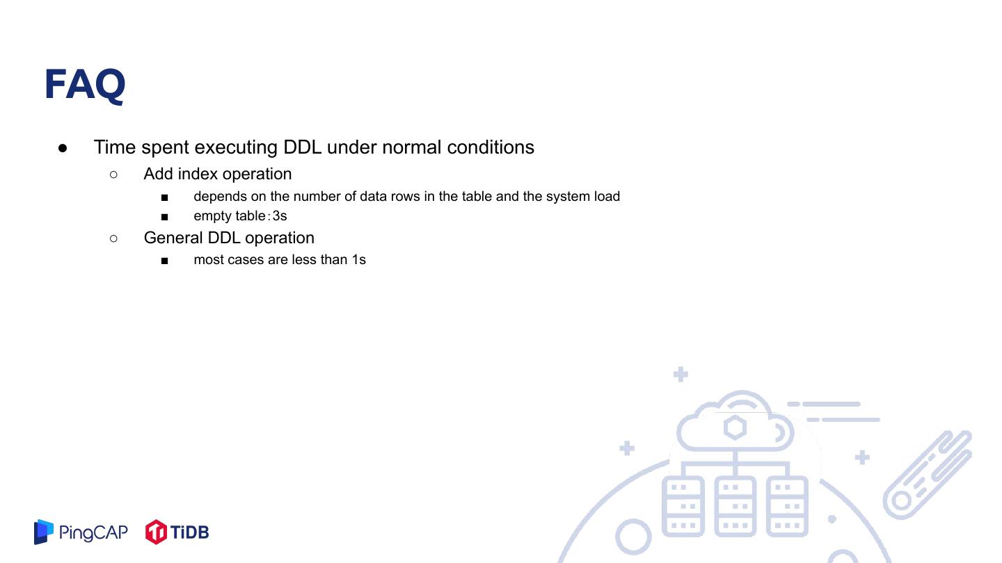 28 .FAQ ● Time spent executing DDL under normal conditions ○ Add index operation ■ depends on the number of data rows in the table and the system load ■ empty table:3s ○ General DDL operation ■ most cases are less than 1s