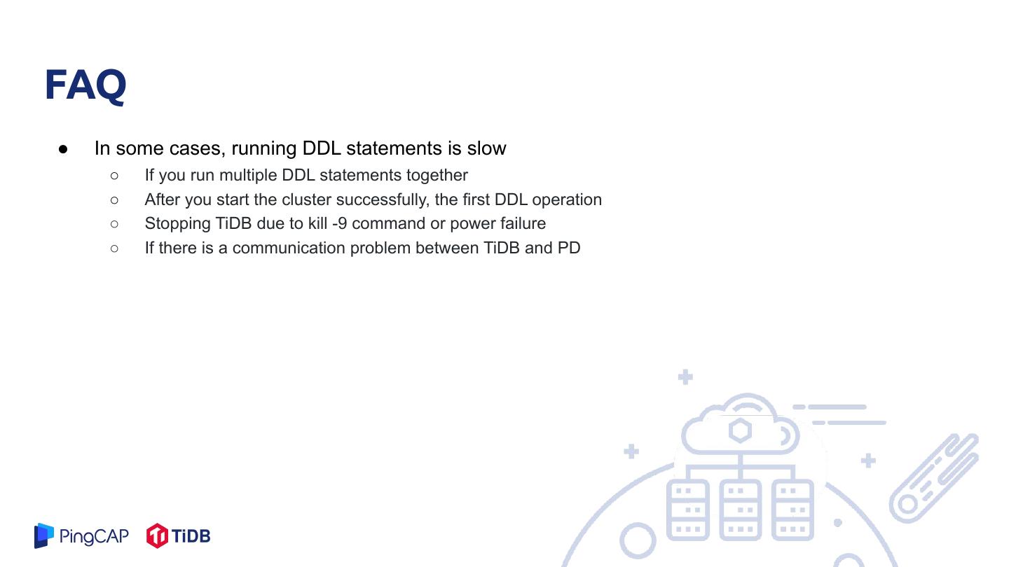 29 .FAQ ● In some cases, running DDL statements is slow ○ If you run multiple DDL statements together ○ After you start the cluster successfully, the first DDL operation ○ Stopping TiDB due to kill -9 command or power failure ○ If there is a communication problem between TiDB and PD
