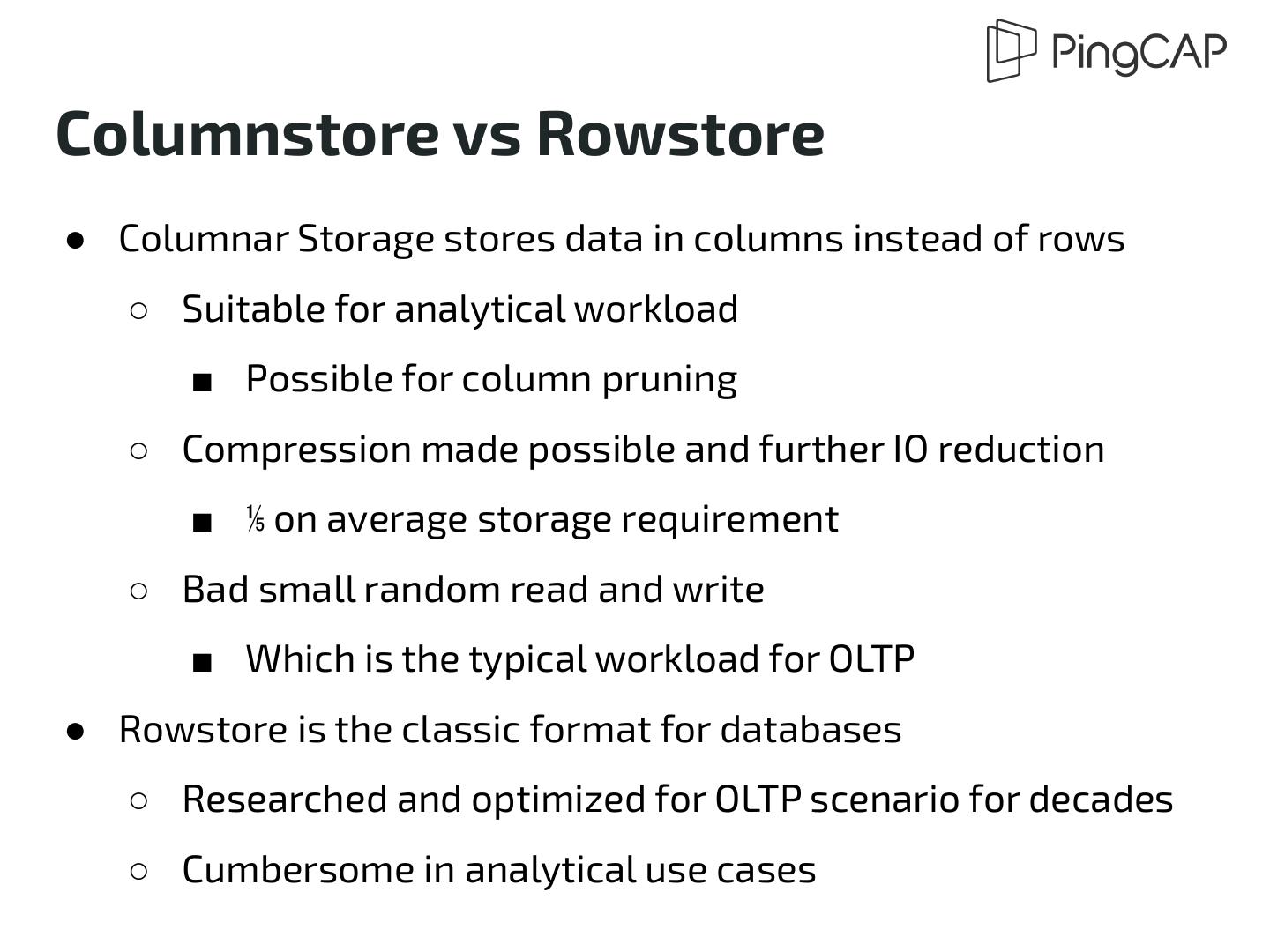 15 .Columnstore vs Rowstore ● Columnar Storage stores data in columns instead of rows ○ Suitable for analytical workload ■ Possible for column pruning ○ Compression made possible and further IO reduction ■ ⅕ on average storage requirement ○ Bad small random read and write ■ Which is the typical workload for OLTP ● Rowstore is the classic format for databases ○ Researched and optimized for OLTP scenario for decades ○ Cumbersome in analytical use cases