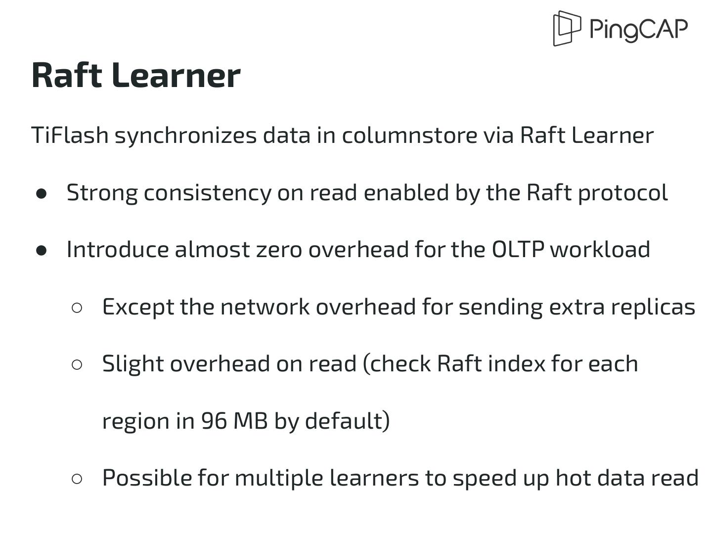 18 .Raft Learner TiFlash synchronizes data in columnstore via Raft Learner ● Strong consistency on read enabled by the Raft protocol ● Introduce almost zero overhead for the OLTP workload ○ Except the network overhead for sending extra replicas ○ Slight overhead on read (check Raft index for each region in 96 MB by default) ○ Possible for multiple learners to speed up hot data read