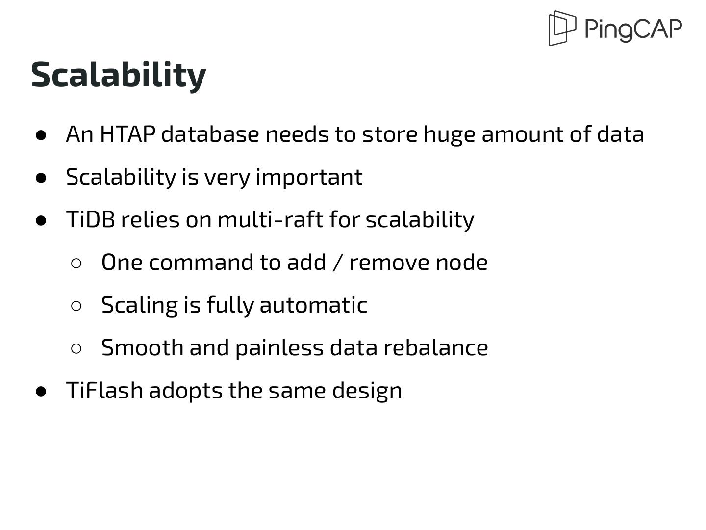 22 .Scalability ● An HTAP database needs to store huge amount of data ● Scalability is very important ● TiDB relies on multi-raft for scalability ○ One command to add / remove node ○ Scaling is fully automatic ○ Smooth and painless data rebalance ● TiFlash adopts the same design