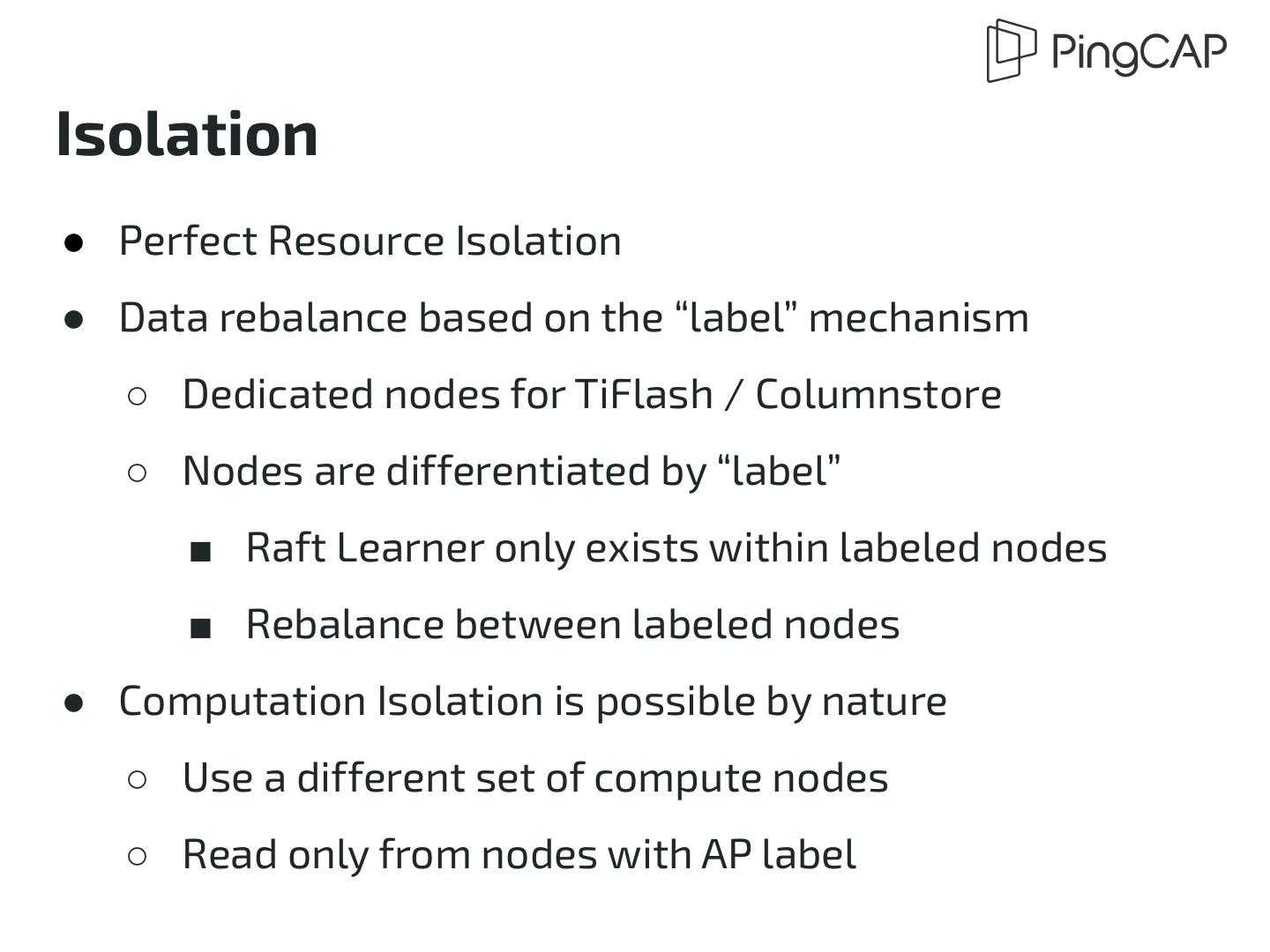 23 .Isolation ● Perfect Resource Isolation ● Data rebalance based on the “label” mechanism ○ Dedicated nodes for TiFlash / Columnstore ○ Nodes are differentiated by “label” ■ Raft Learner only exists within labeled nodes ■ Rebalance between labeled nodes ● Computation Isolation is possible by nature ○ Use a different set of compute nodes ○ Read only from nodes with AP label