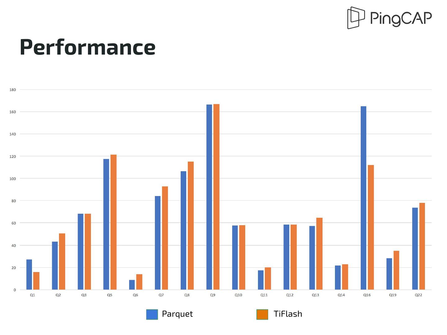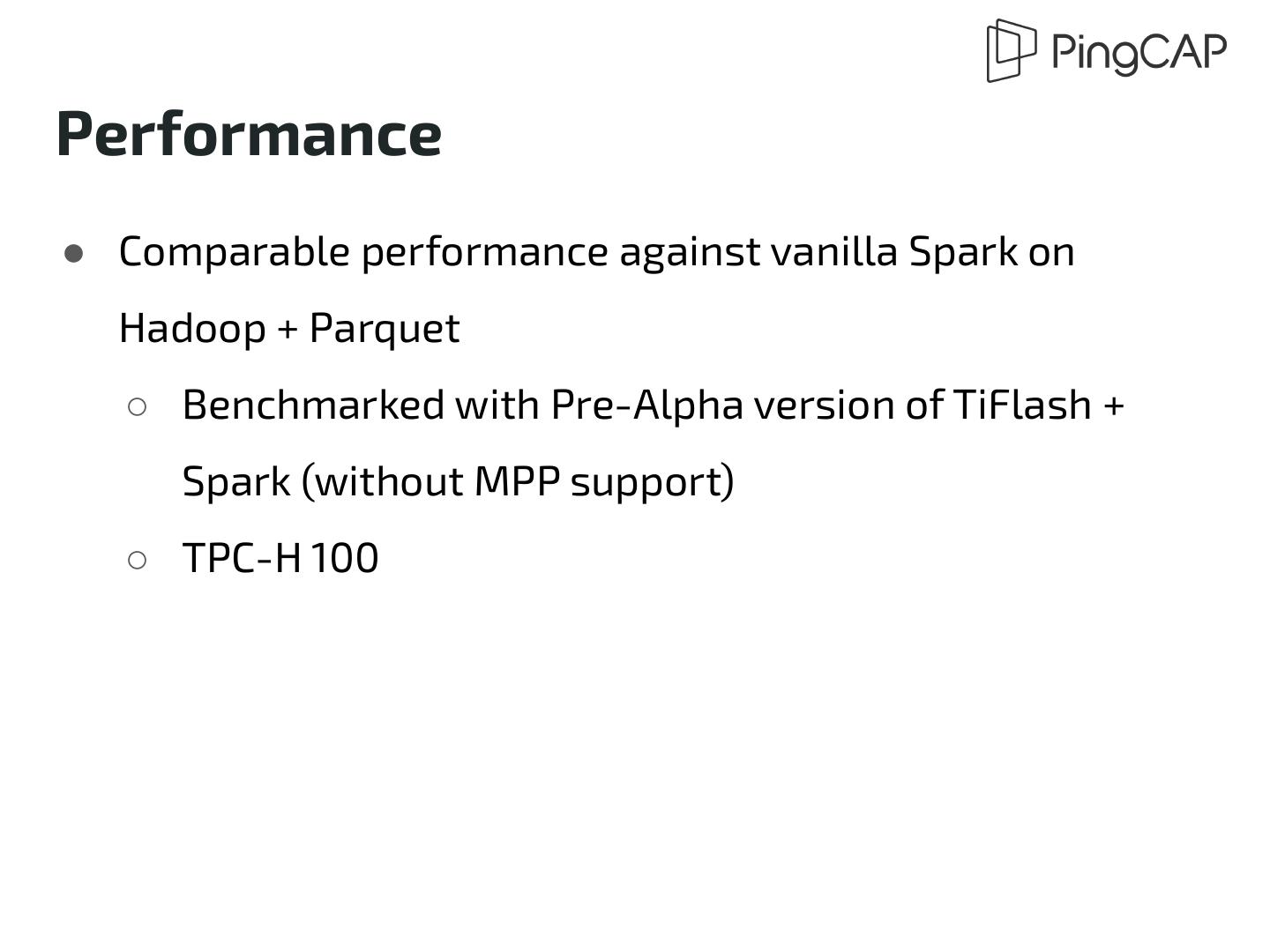 29 .Performance ● Comparable performance against vanilla Spark on Hadoop + Parquet ○ Benchmarked with Pre-Alpha version of TiFlash + Spark (without MPP support) ○ TPC-H 100