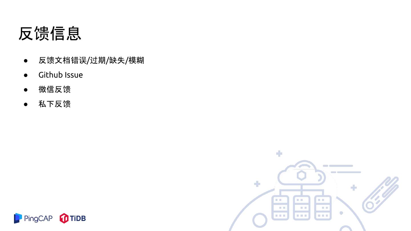 17 .反馈信息 ● 反馈文档错误/过期/缺失/模糊 ● Github Issue ● 微信反馈 ● 私下反馈