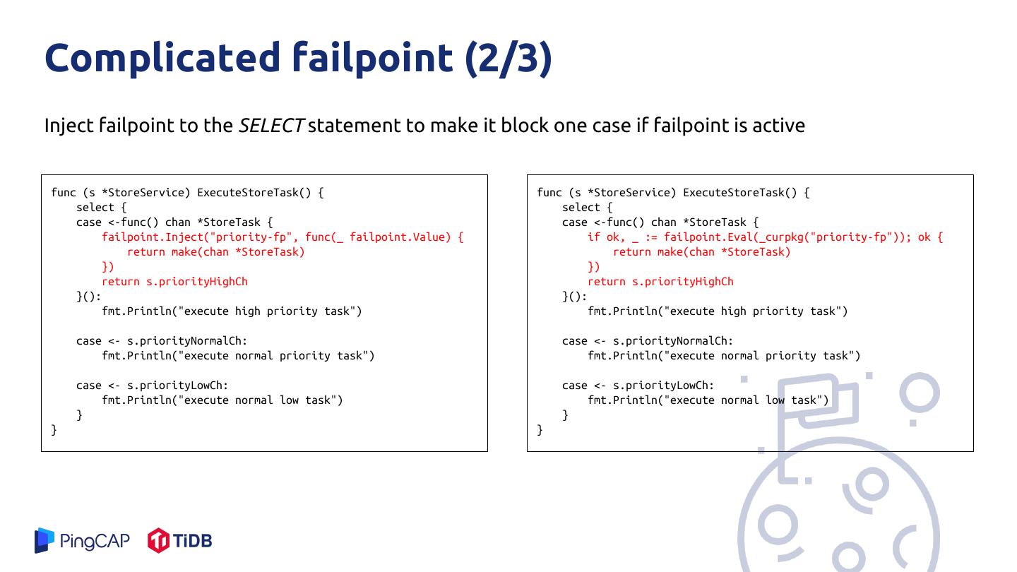 22 .failpoint.Break ● Can be used in a loop context ● Break to a label ● Label is also used by non-failpoint code label: label: for i := 0; i < 100; i++ { for i := 0; i < 100; i++ { if i % 5 == 0 { if i % 5 == 0 { continue label continue label } } failpoint.Inject("control-flow", func(val failpoint.Value) { if ok, _ := failpoint.Eval(_curpkg_("control-flow")); ok { if i%10 == val.(int) { if i%10 == val.(int) { failpoint.Break("label") break label } } }) } } }
