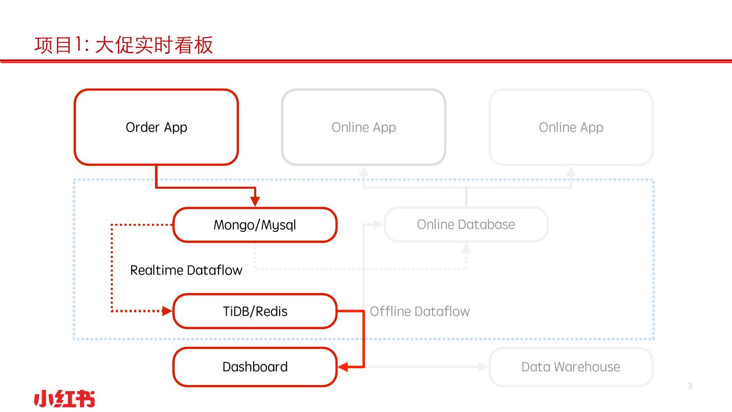 3 .项⺫1: ⼤促实时看板 Order App Online App Online App Mongo/Mysql Online Database Realtime Dataflow TiDB/Redis Offline Dataflow Dashboard Data Warehouse 3