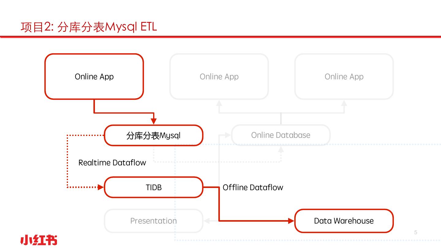 5 .项⺫2: 分库分表Mysql ETL Online App Online App Online App 分库分表Mysql Online Database Realtime Dataflow TIDB Offline Dataflow Presentation Data Warehouse 5