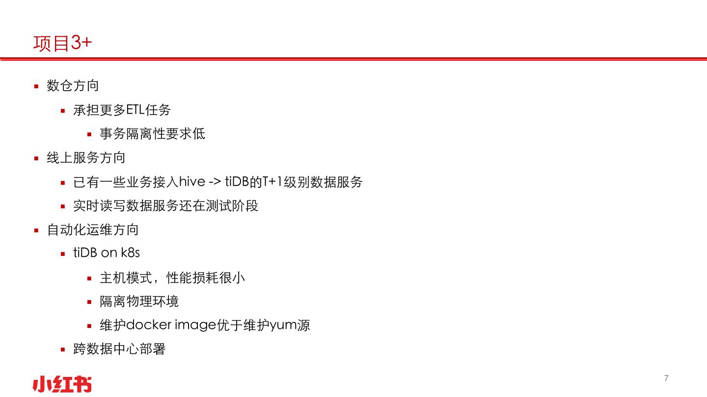 6 .项⺫1: ⼤促实时看板 ▪ 业务场景(以最⼤的表为例) ▪ 上游10节点的MySQL,共计10000个分表,存量数据1000亿条左右,每⽇增量10亿+ ▪ QPS写⼊均值3000条/s,峰值接近10000条/s ▪ 增量ETL任务,故离线库只需保留约30天的dtm表 ▪ 每⽇夜间(⽩天偶尔)会有基于sqoop的抽数任务触发 ▪ 集群规模(以最⼤的数据表为例) ▪ 10 tikv + 3tipd ▪ 每个节点挂载4T*6块NVME SSD ▪ 实现细节 ▪ 对mysql⾃增ID进⾏了处理 ▪ 对sqoop进⾏了部分对于tiDB的适配 ▪ 调整了tidb的max transaction size,以优化抽取效率 6