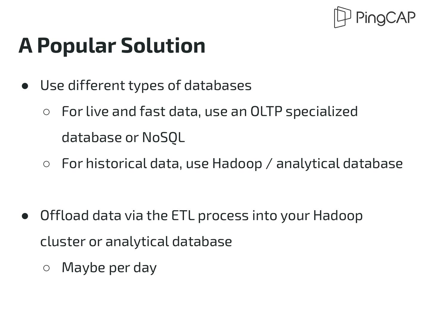 7 .A Popular Solution ● Use different types of databases ○ For live and fast data, use an OLTP specialized database or NoSQL ○ For historical data, use Hadoop / analytical database ● Offload data via the ETL process into your Hadoop cluster or analytical database ○ Maybe per day