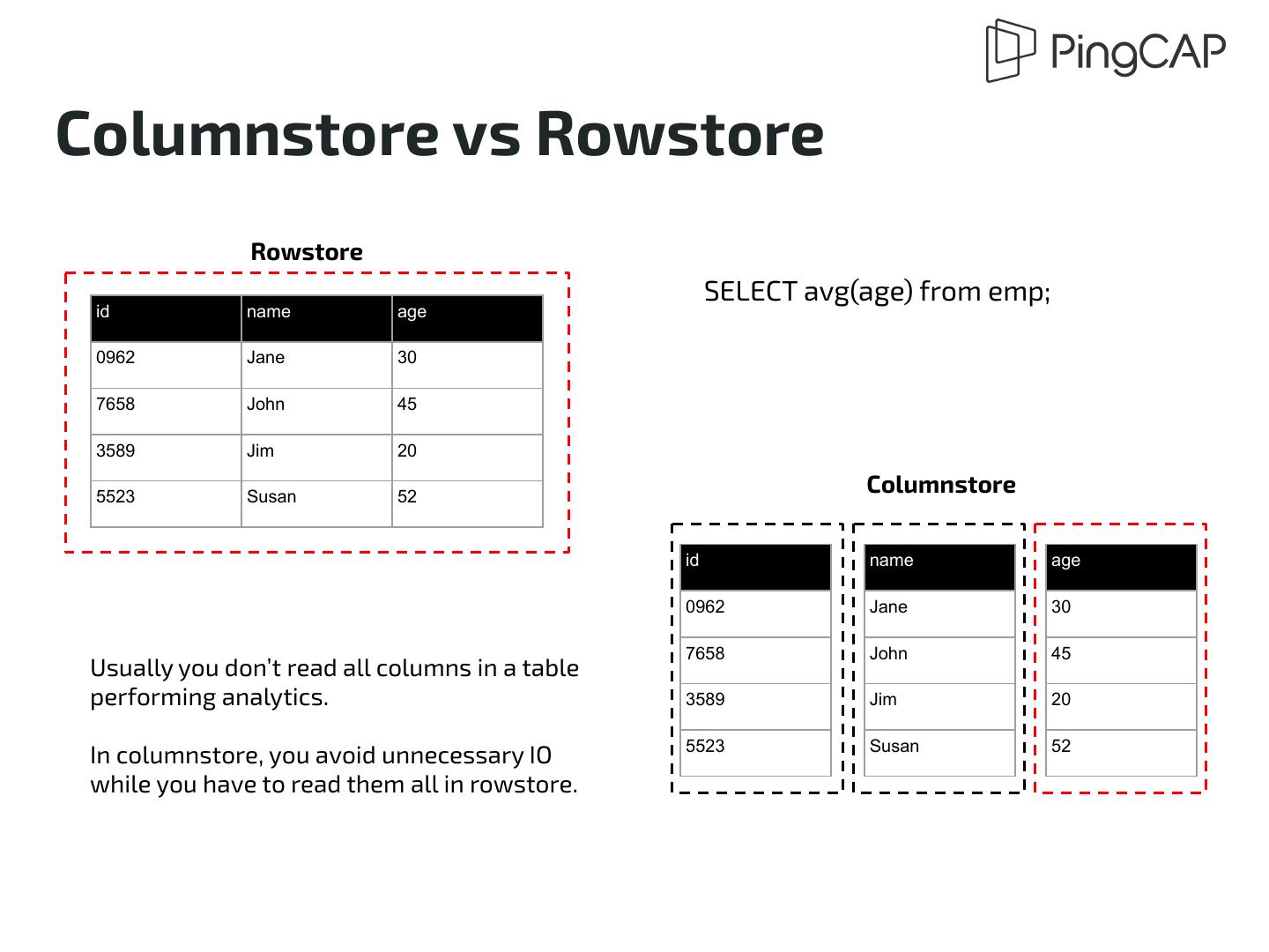 15 .Columnstore vs Rowstore ● Columnar Storage stores data in columns instead of rows ○ Suitable for analytical workload ■ Possible for column pruning ○ Compression made possible and further IO reduction ■ ⅕ on average storage requirement ○ Bad small random read and write ■ Which is the typical workload for OLTP ● Rowstore is the classic format for databases ○ Researched and optimized for OLTP scenario for decades ○ Cumbersome in analytical use cases