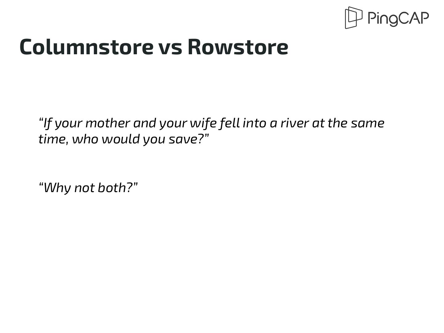 17 .Columnstore vs Rowstore “If your mother and your wife fell into a river at the same time, who would you save?” “Why not both?”