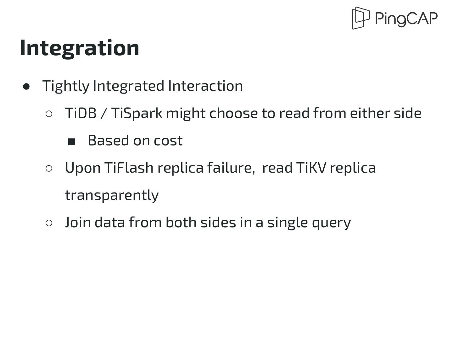 25 .Integration ● Tightly Integrated Interaction ○ TiDB / TiSpark might choose to read from either side ■ Based on cost ○ Upon TiFlash replica failure, read TiKV replica transparently ○ Join data from both sides in a single query