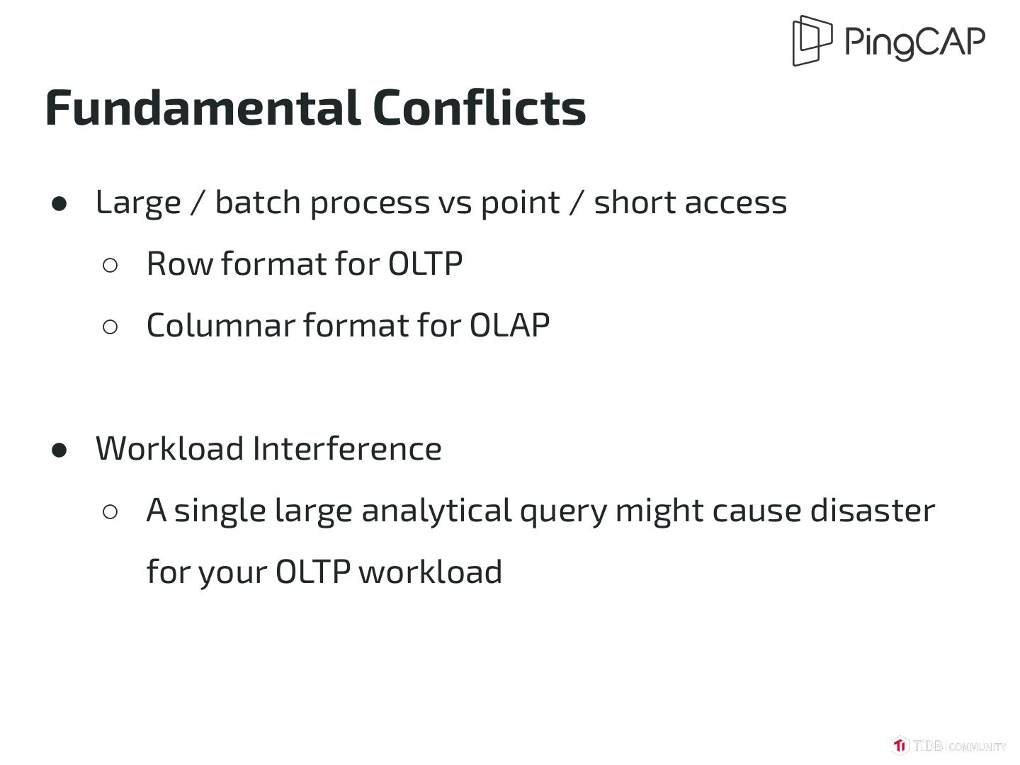 4 .Fundamental Conflicts ● Large / batch process vs point / short access ○ Row format for OLTP ○ Columnar format for OLAP ● Workload Interference ○ A single large analytical query might cause disaster for your OLTP workload